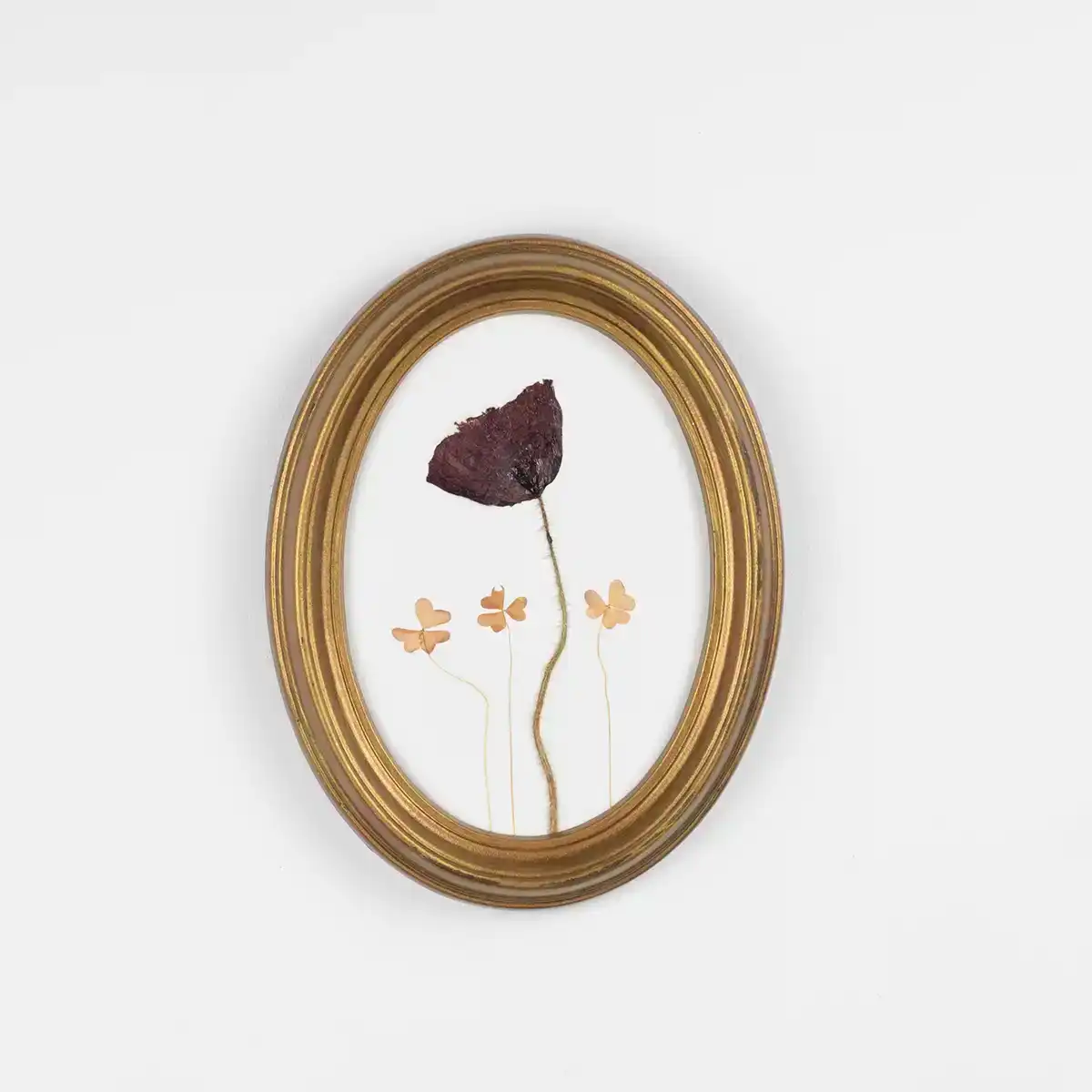 Amapola prensada en marco ovalado antiguo, estilo herbario.