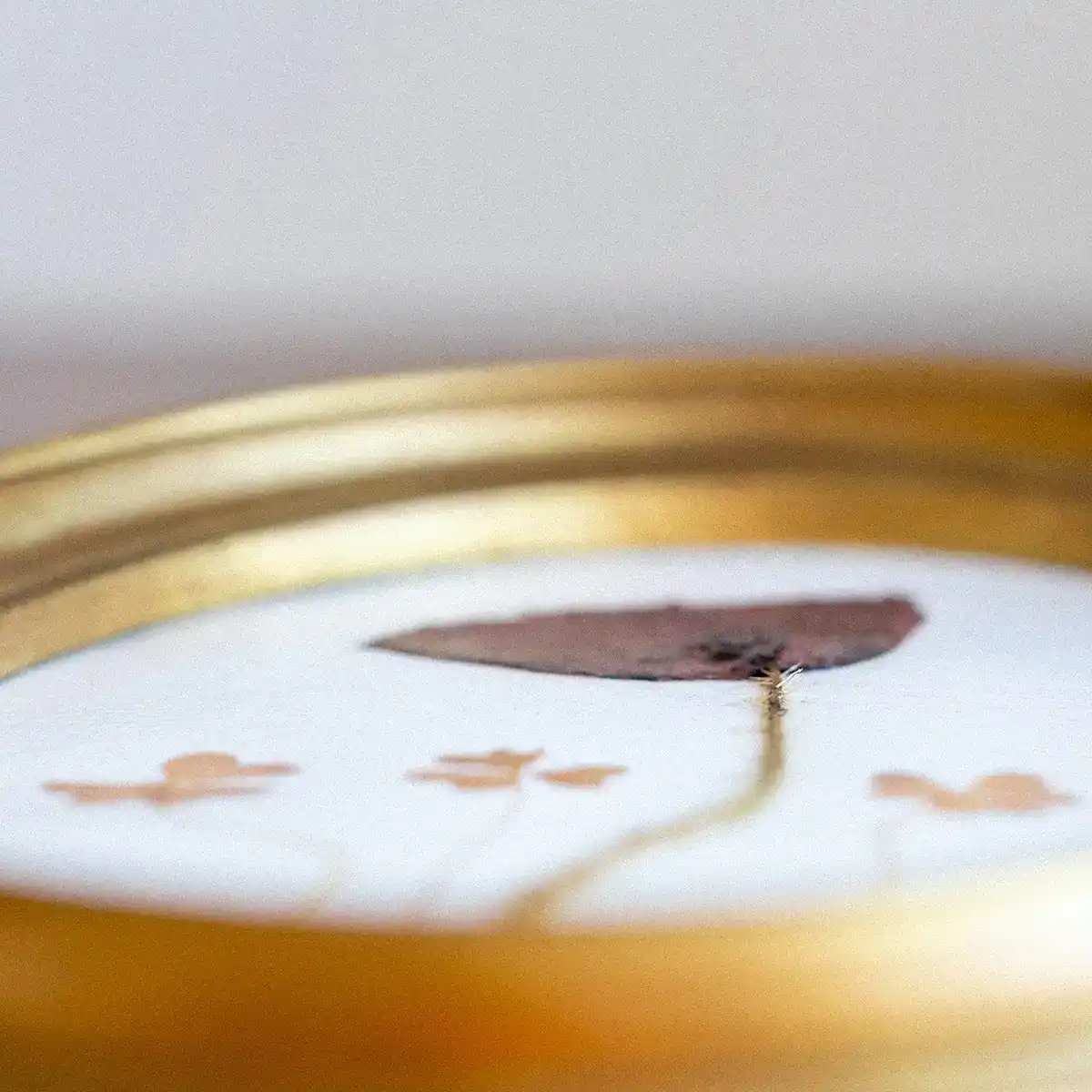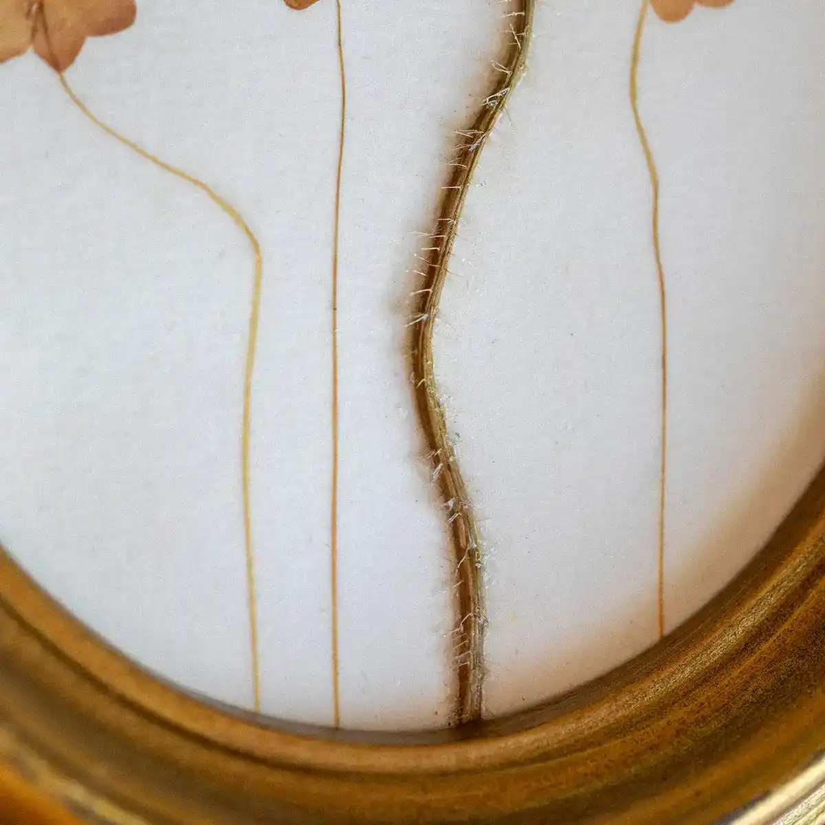 El prensado conserva los colores naturales: burdeos profundo, ocres suaves y verdes apagados. La composición, de trazo vertical y delicado, está dispuesta sobre cartulina de acuarela blanca, libre de ácidos, que realza la intensidad de los tonos vegetales.