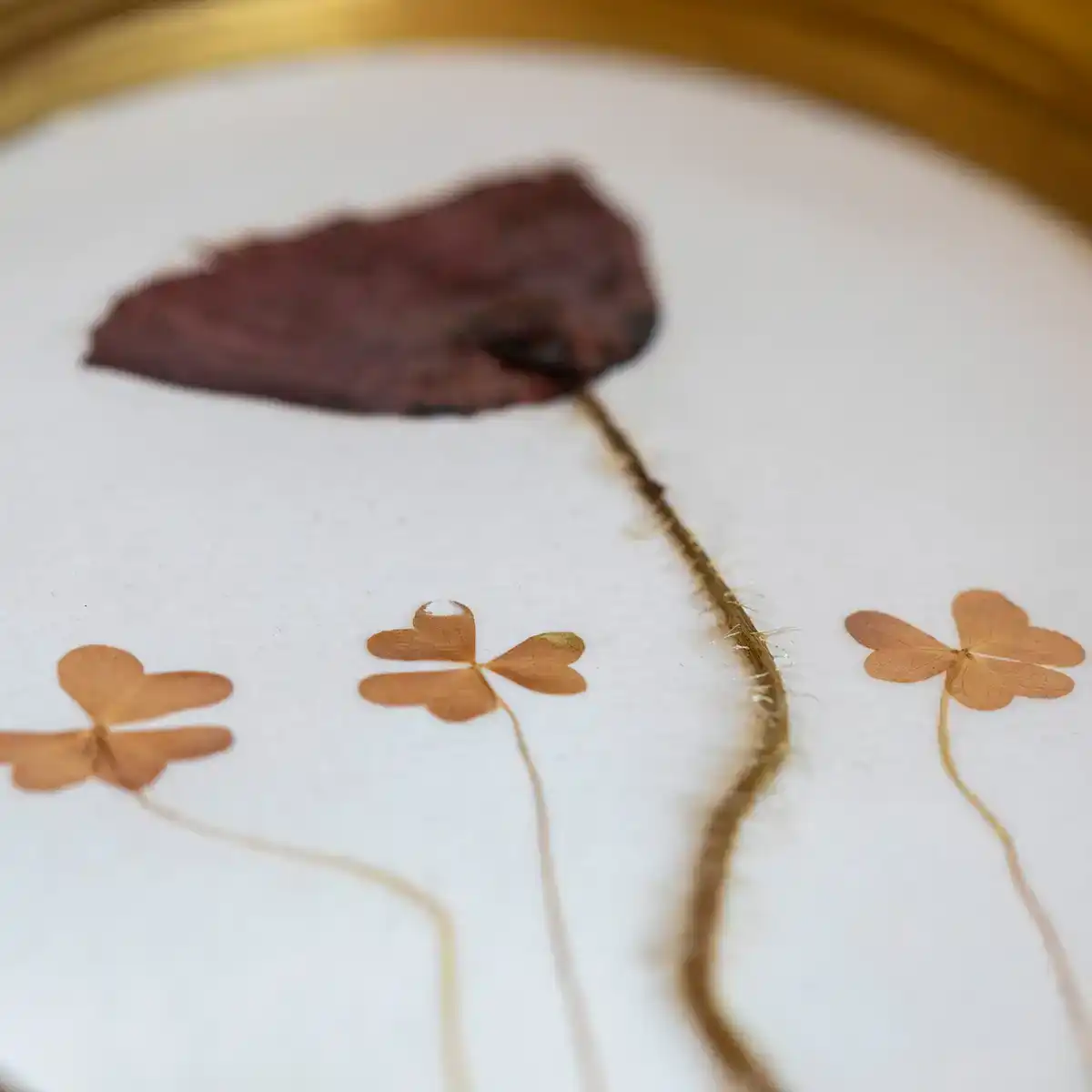 Cuadro botánico con amapola prensada de pétalo burdeos profundo, acompañada por pequeños tréboles silvestres de hojas redondeadas en tonos ocre. Recolectadas a mano y prensadas durante al menos cuatro semanas, utilizando presión continua y papel secante neutro, sin aditivos ni productos químicos.