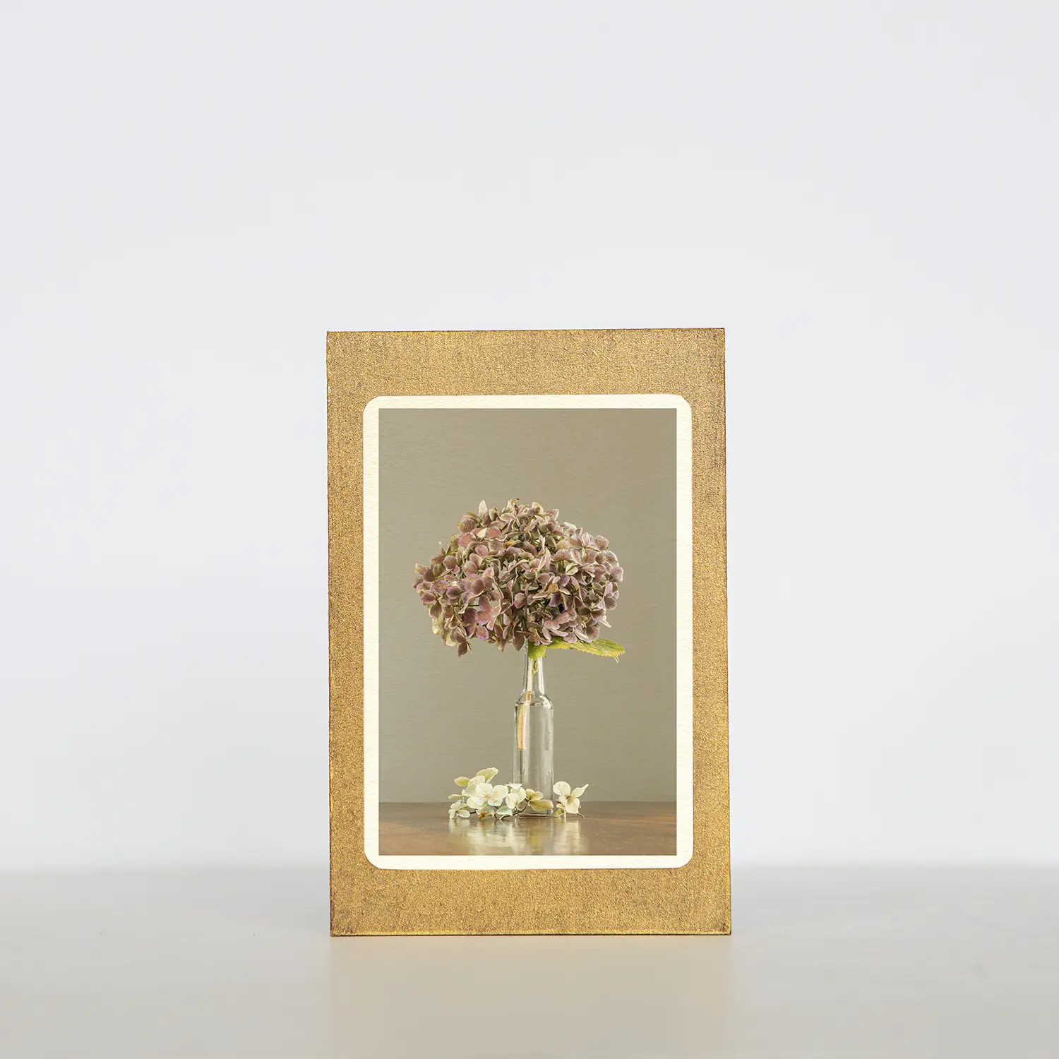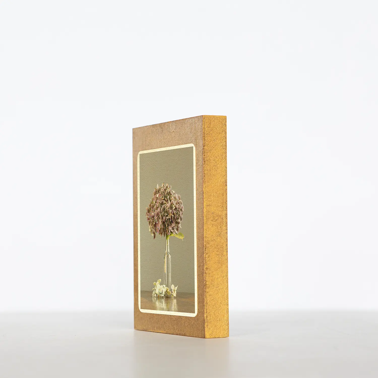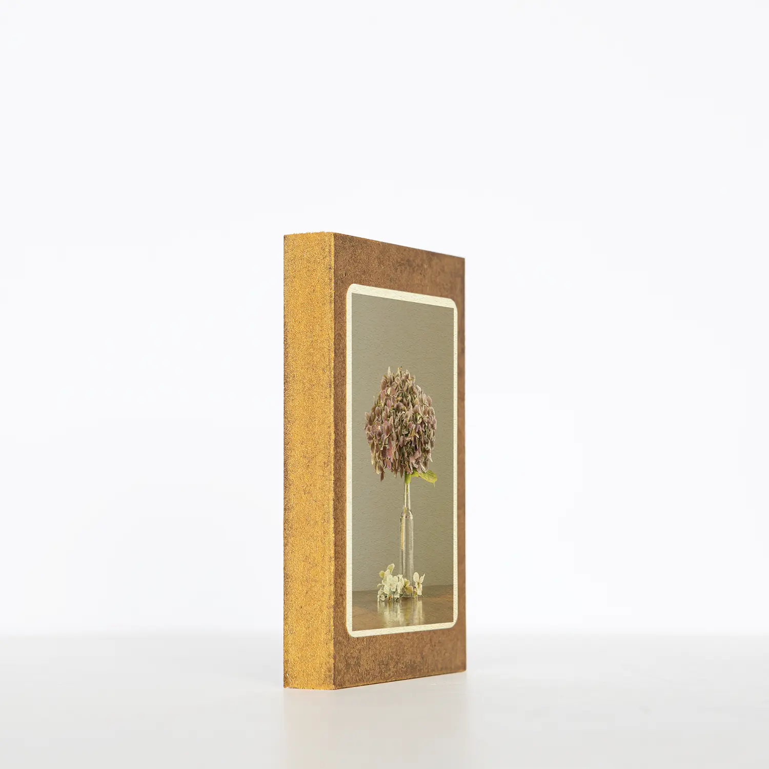 La escena está impresa sobre papel fotográfico y montada en madera dorada, evocando las estampas clásicas.