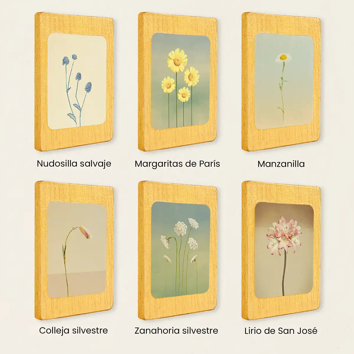 Set 6 imanes flores botánicas en madera dorada vintage.