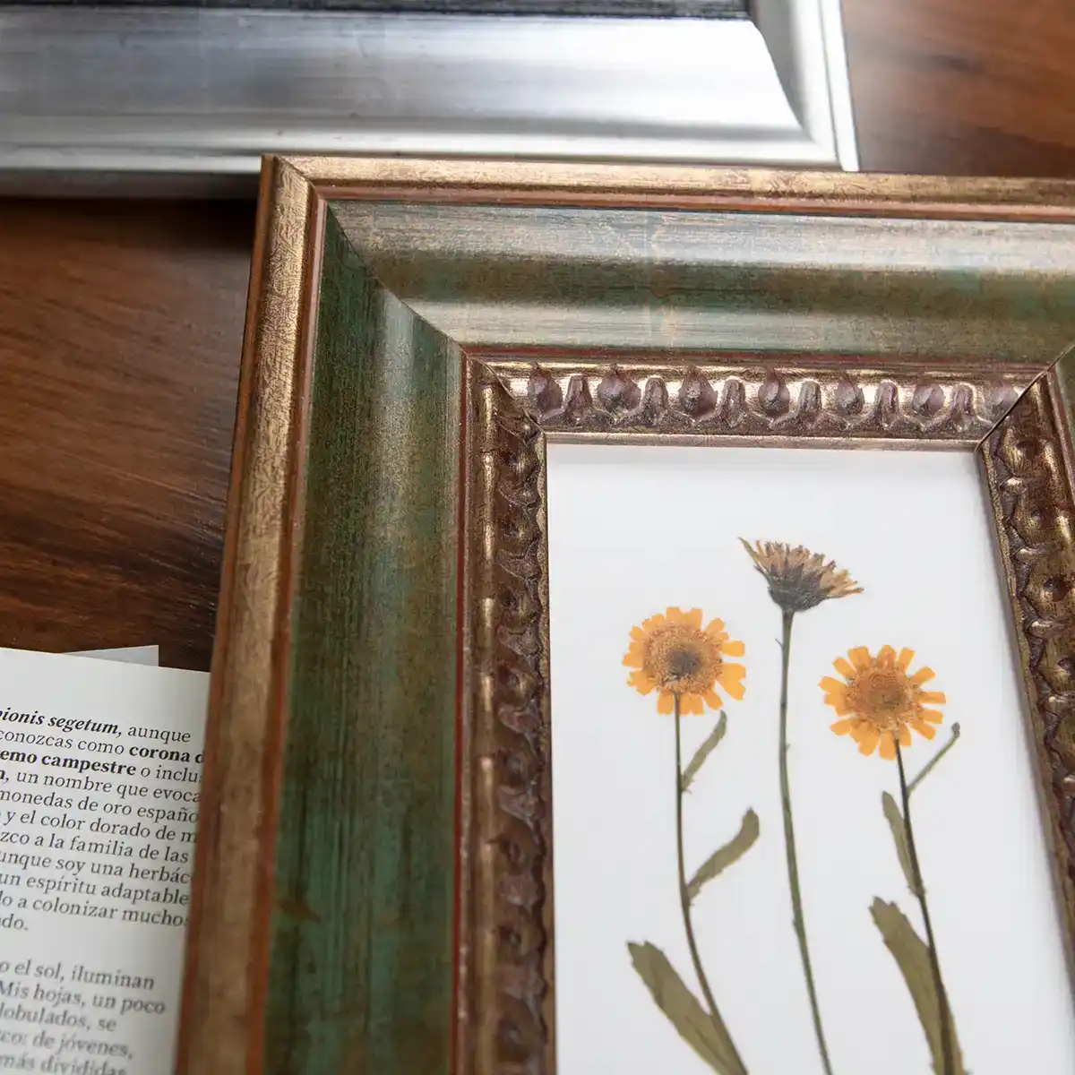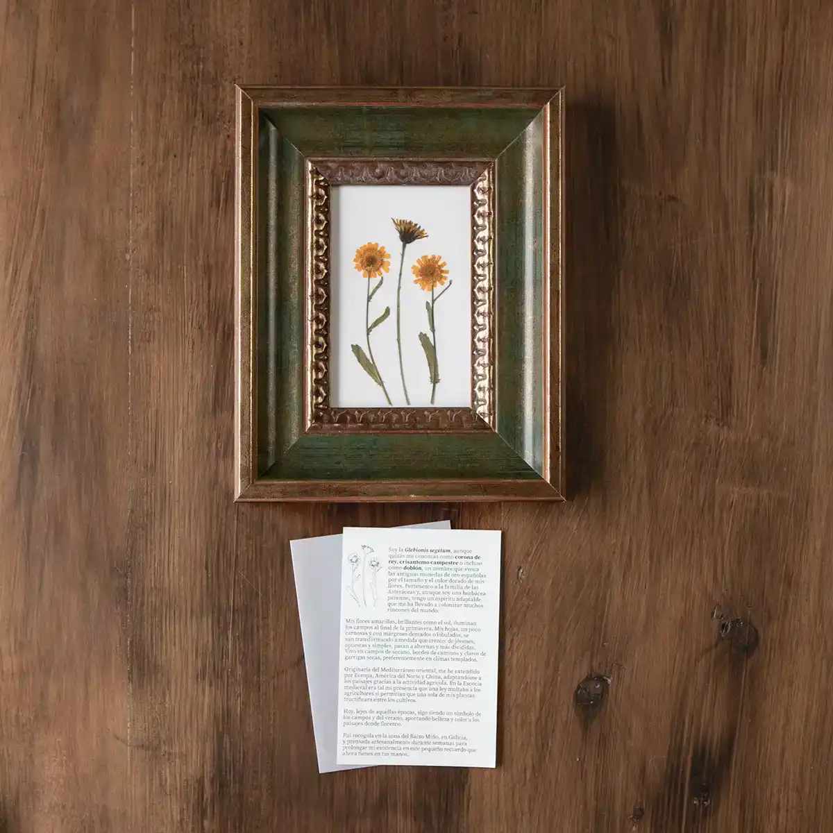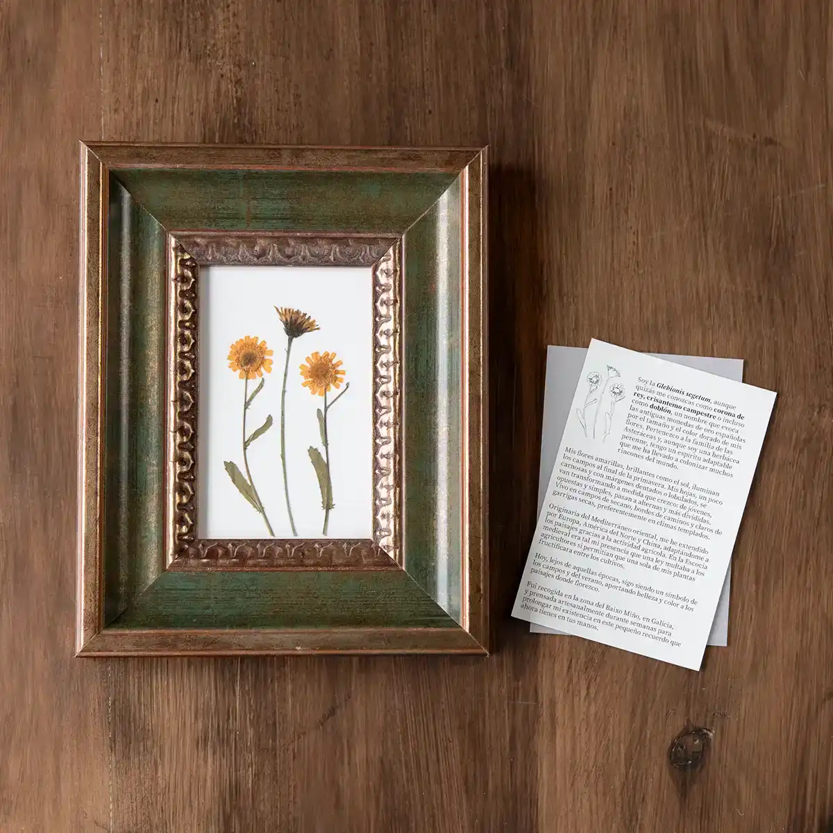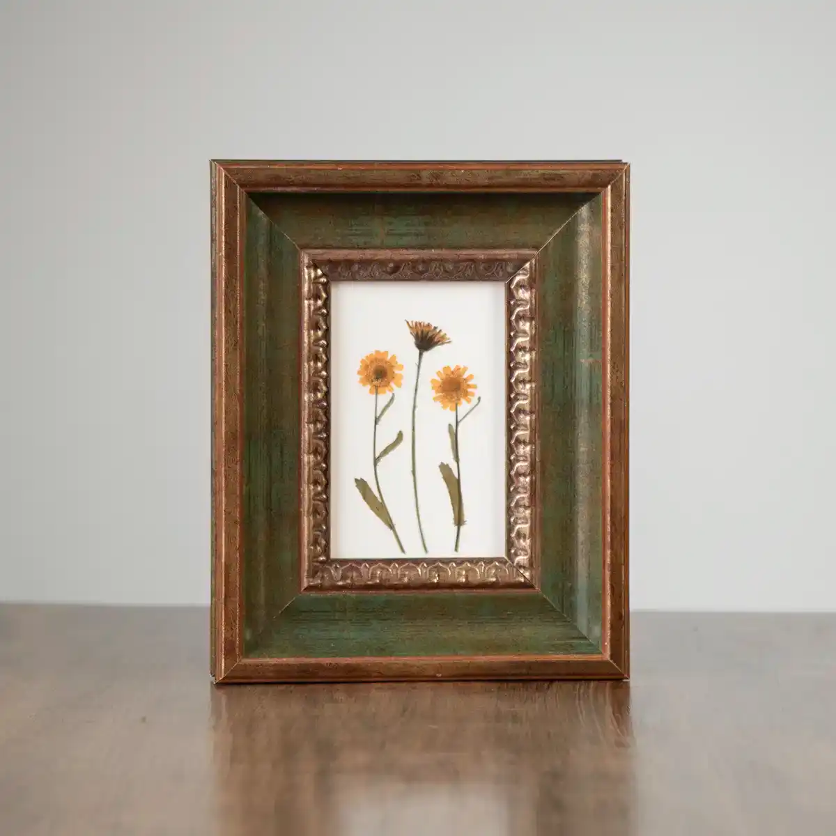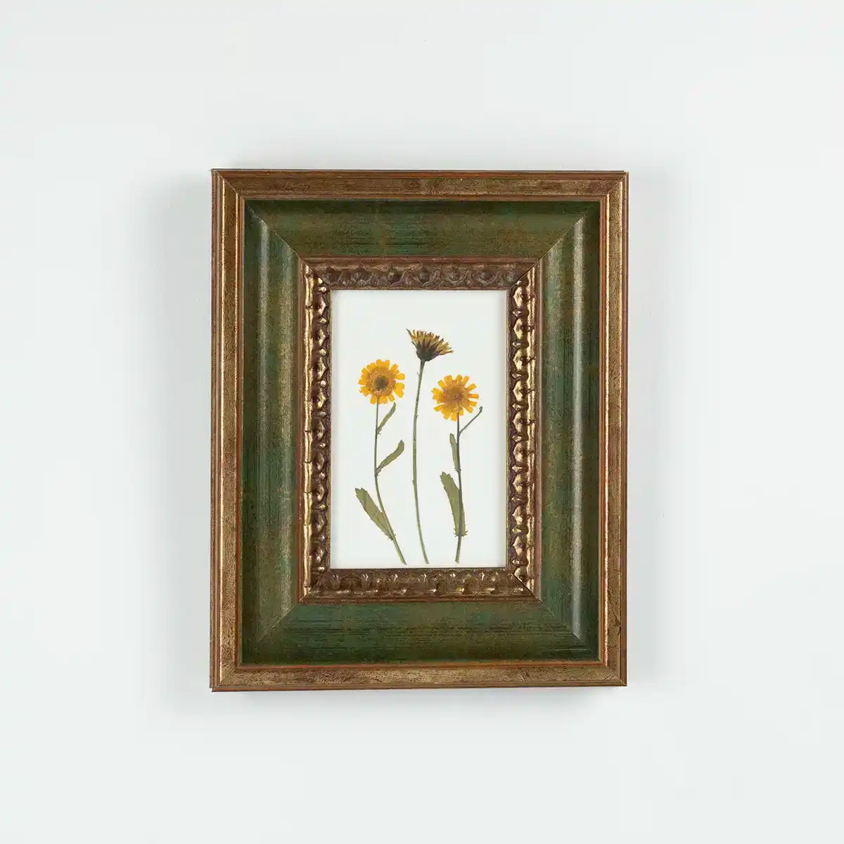 Composición floral prensada con caléndulas silvestres en marco verde vintage
