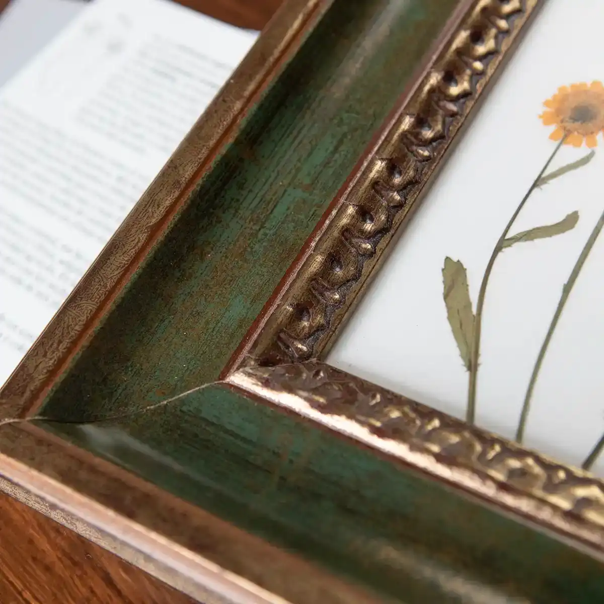 El marco es de madera con acabado envejecido en tono verde musgo profundo. Una moldura interior dorada, con textura tallada en relieve, aporta contraste y elegancia sin quitar protagonismo a la delicadeza floral. El juego cromático entre el verde terroso y el dorado cálido genera una atmósfera serena, entre lo natural y lo atemporal.