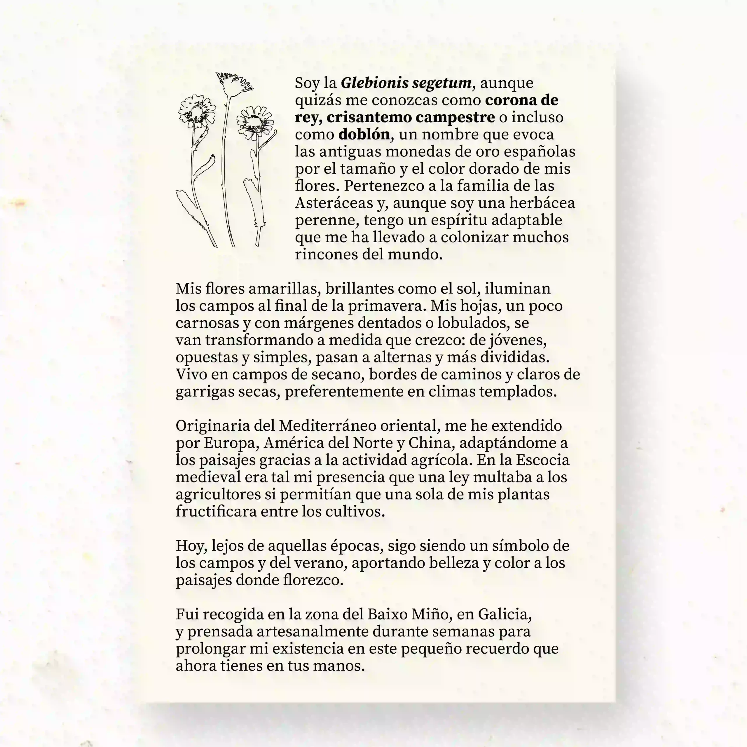 Composición botánica con tres crisantemos silvestres prensados, recolectados a mano y secados durante al menos cuatro semanas mediante presión continua, sin productos químicos ni aditivos. Las flores, dispuestas sobre papel de acuarela blanco libre de ácidos, conservan su color amarillo con matices cálidos.