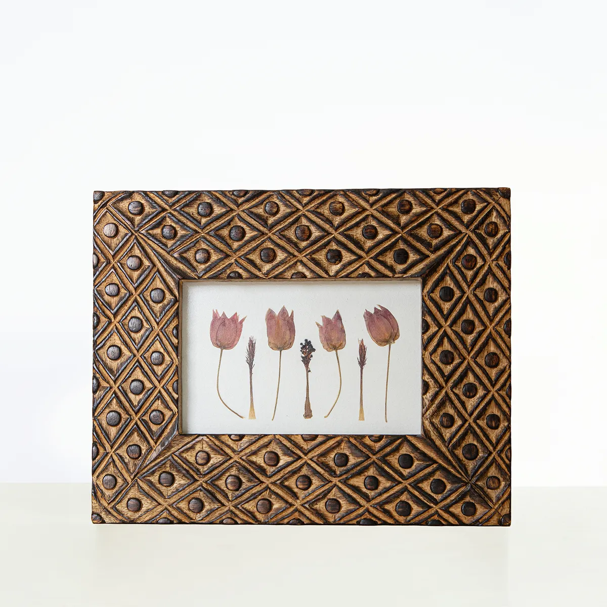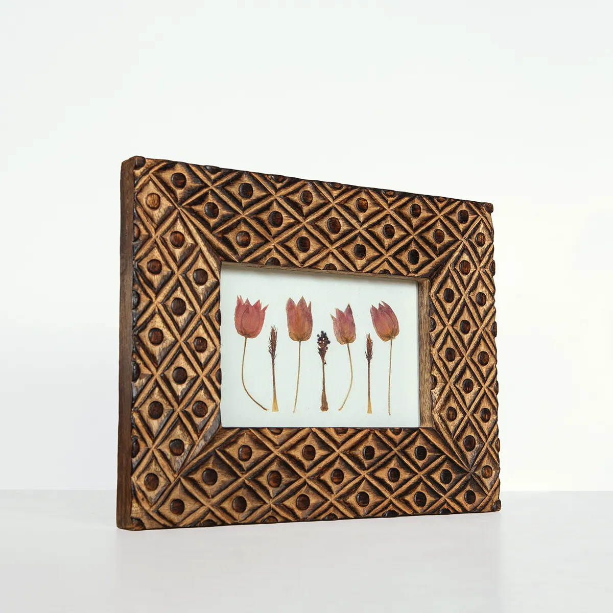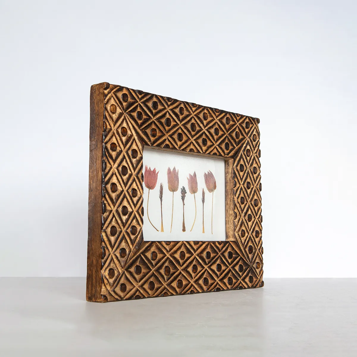 Flor prensada en marco de madera tallada (Pendientes de la reina)