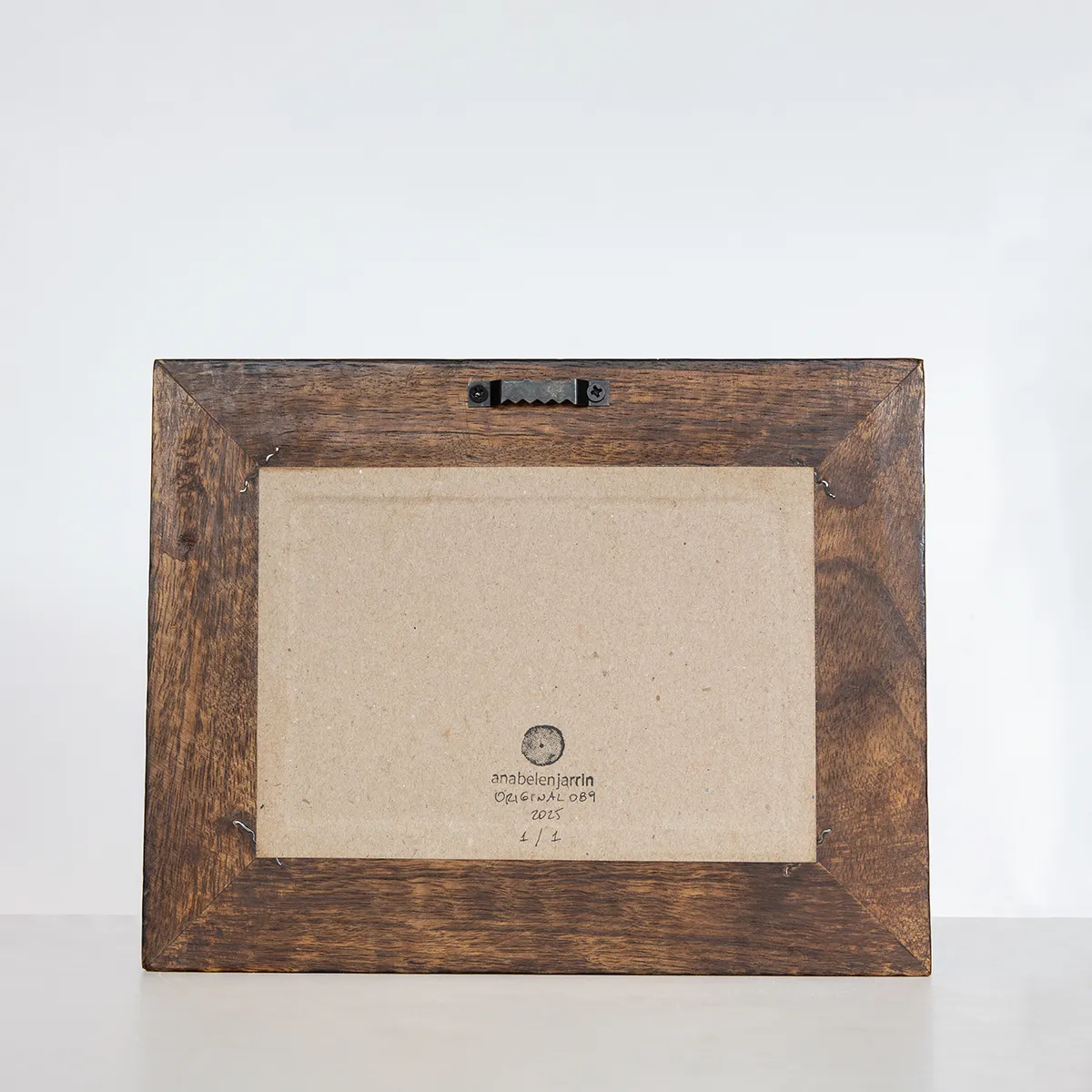 El marco, de madera maciza tallada a mano, ha sido recuperado y restaurado. Su diseño geométrico con textura en relieve recuerda a motivos étnicos y aporta profundidad visual. El acabado con zonas oscurecidas, le da un carácter cálido y atemporal. Cada pieza incorpora cristal museo antirreflejo, que reduce el brillo y protege la obra sin distorsionar su apariencia.
