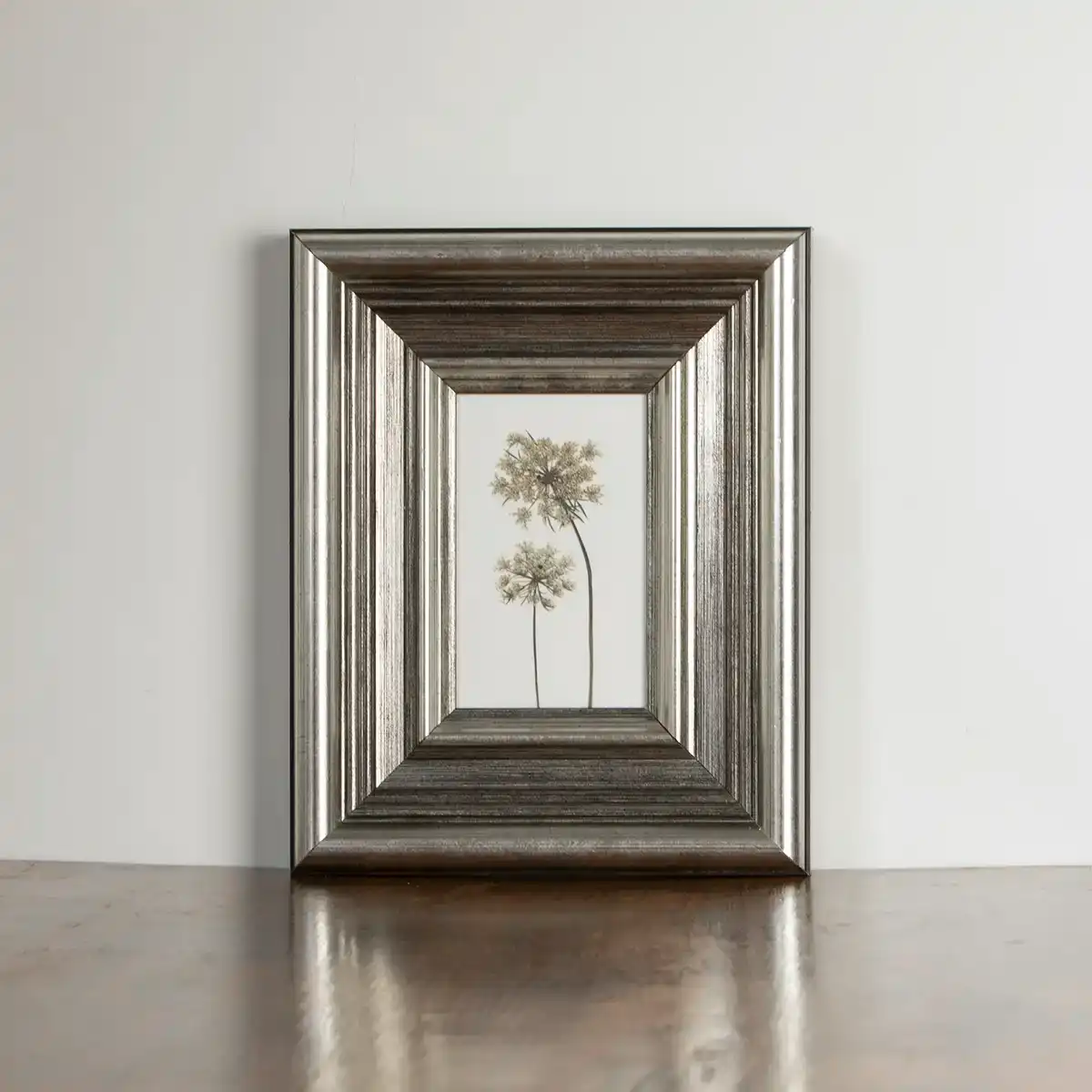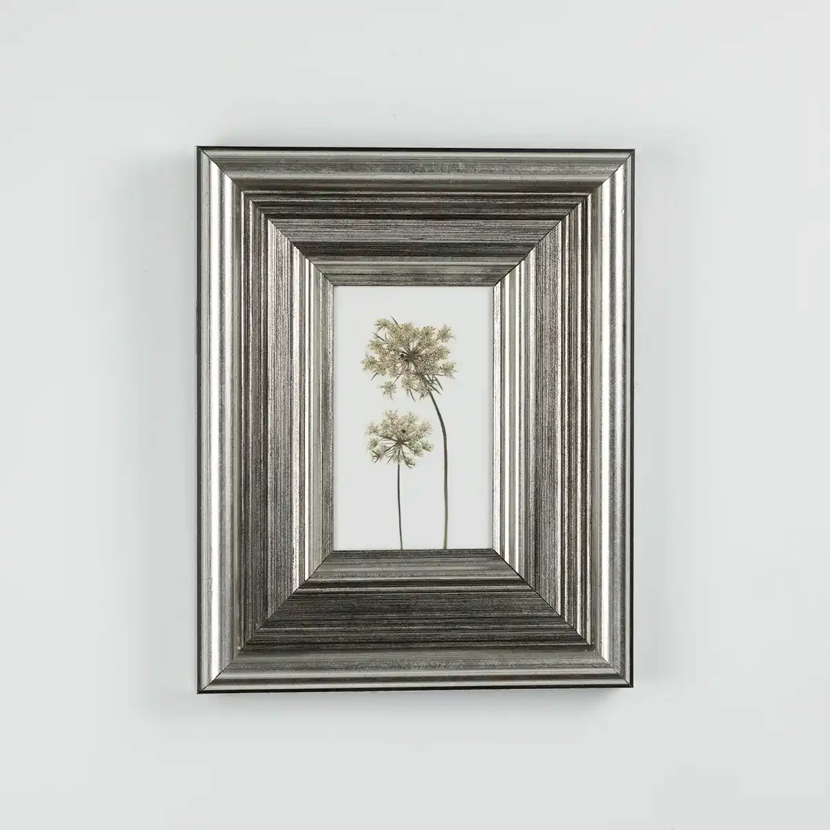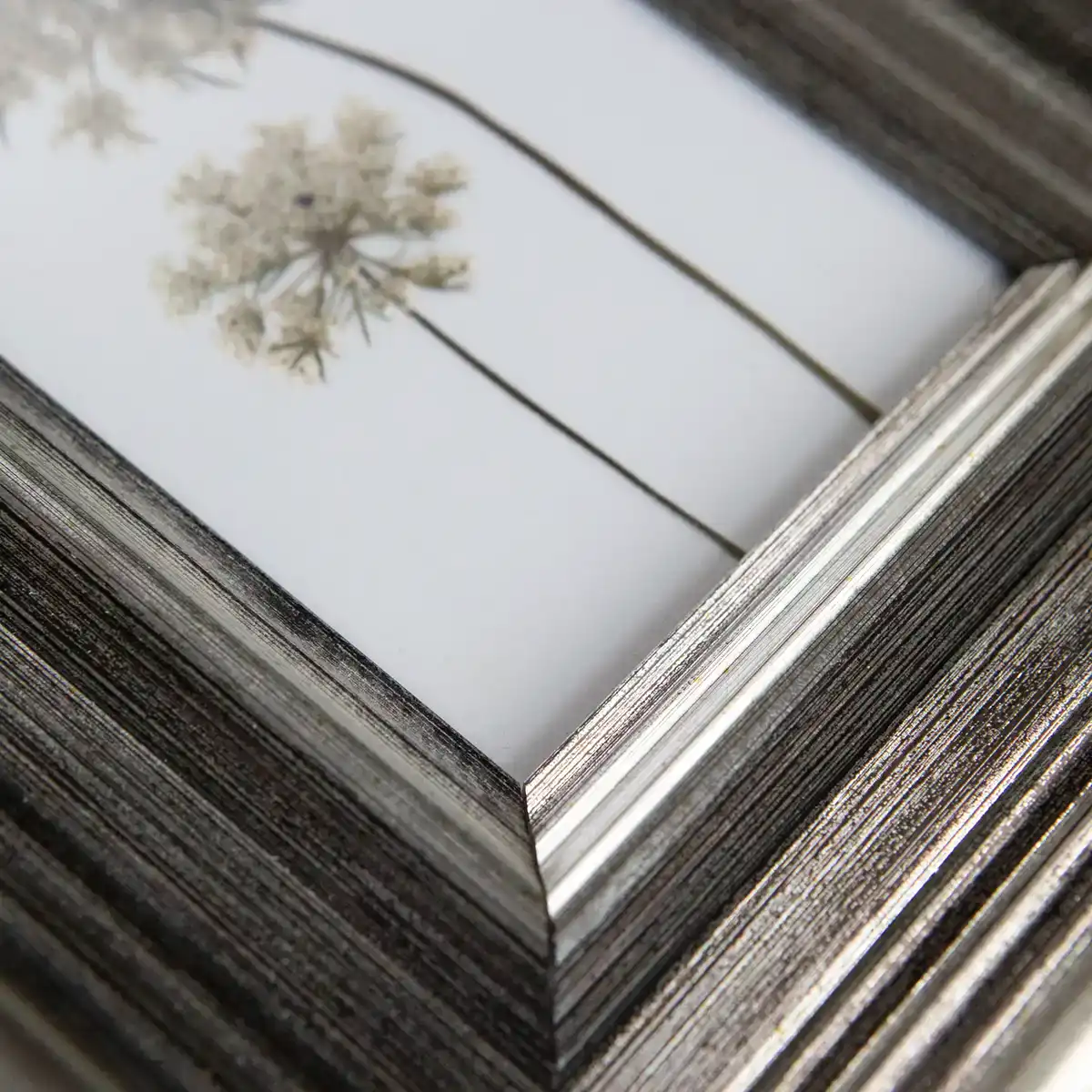El marco, de madera con acabado en plata envejecida, presenta bordes anchos y estriados con líneas anguladas que generan un efecto de profundidad y realce. El contraste entre la geometría marcada del marco y la ligereza botánica de las flores crea una tensión visual sutil y elegante. El cristal antirreflejo protege la obra de los rayos UV y permite observarla sin distorsión.