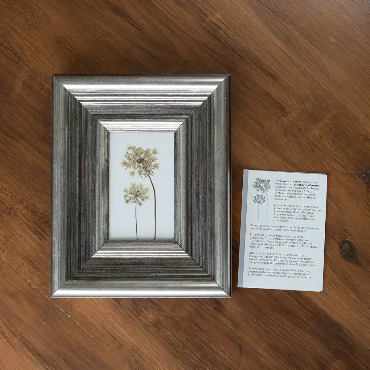 Obra botánica minimalista y estructurada, con dos flores prensadas de zanahoria silvestre (Daucus carota), dispuestas verticalmente sobre cartulina de acuarela blanca libre de ácidos. Las flores, recolectadas a mano y prensadas durante un mínimo de cuatro semanas, conservan su forma, sus tallos alargados y su tono pálido, entre el dorado suave y el beige natural.