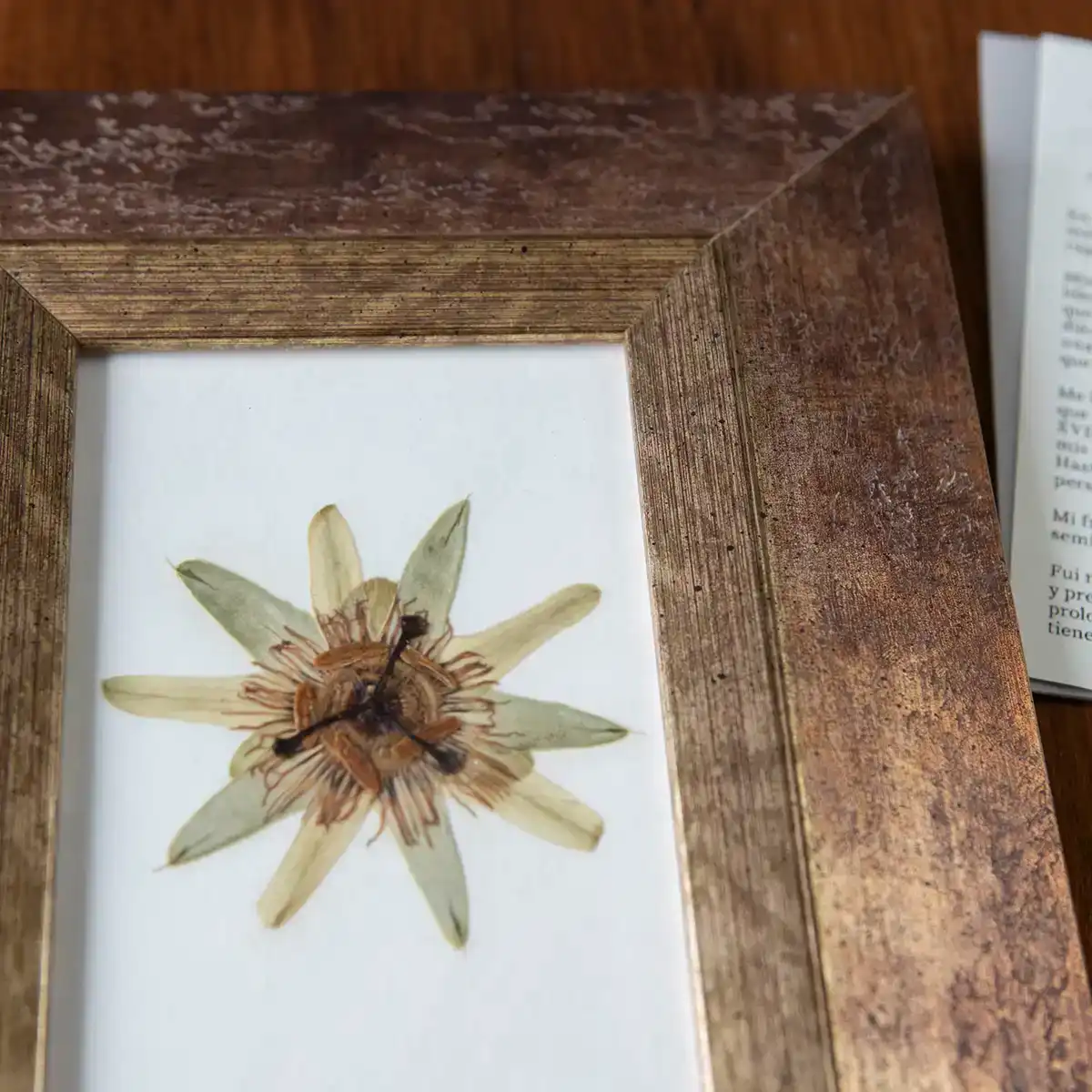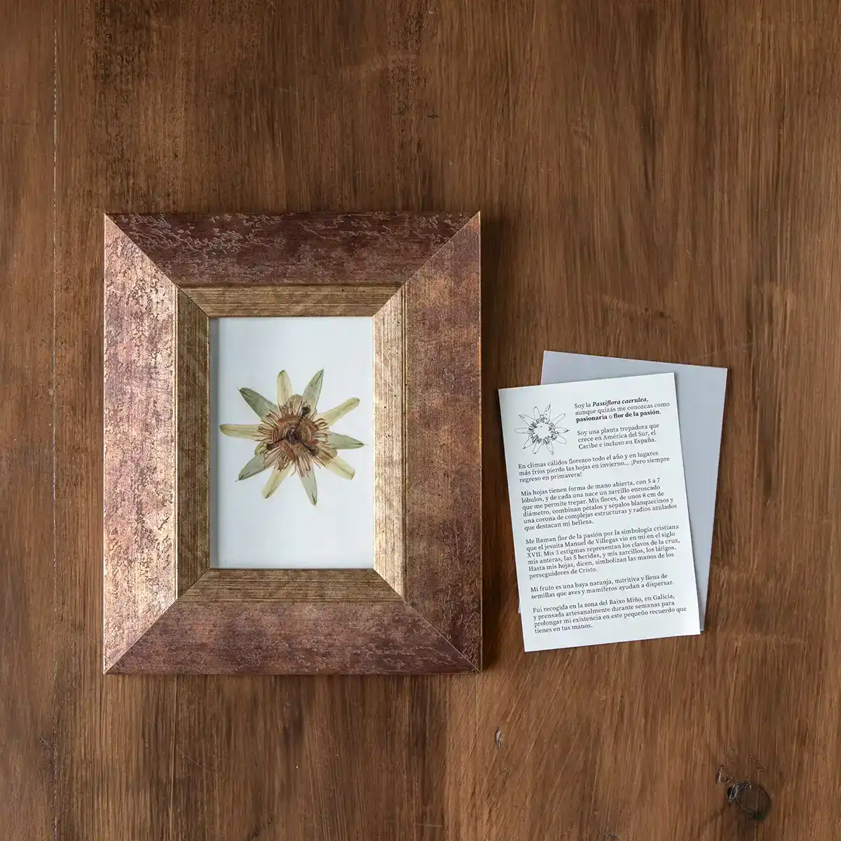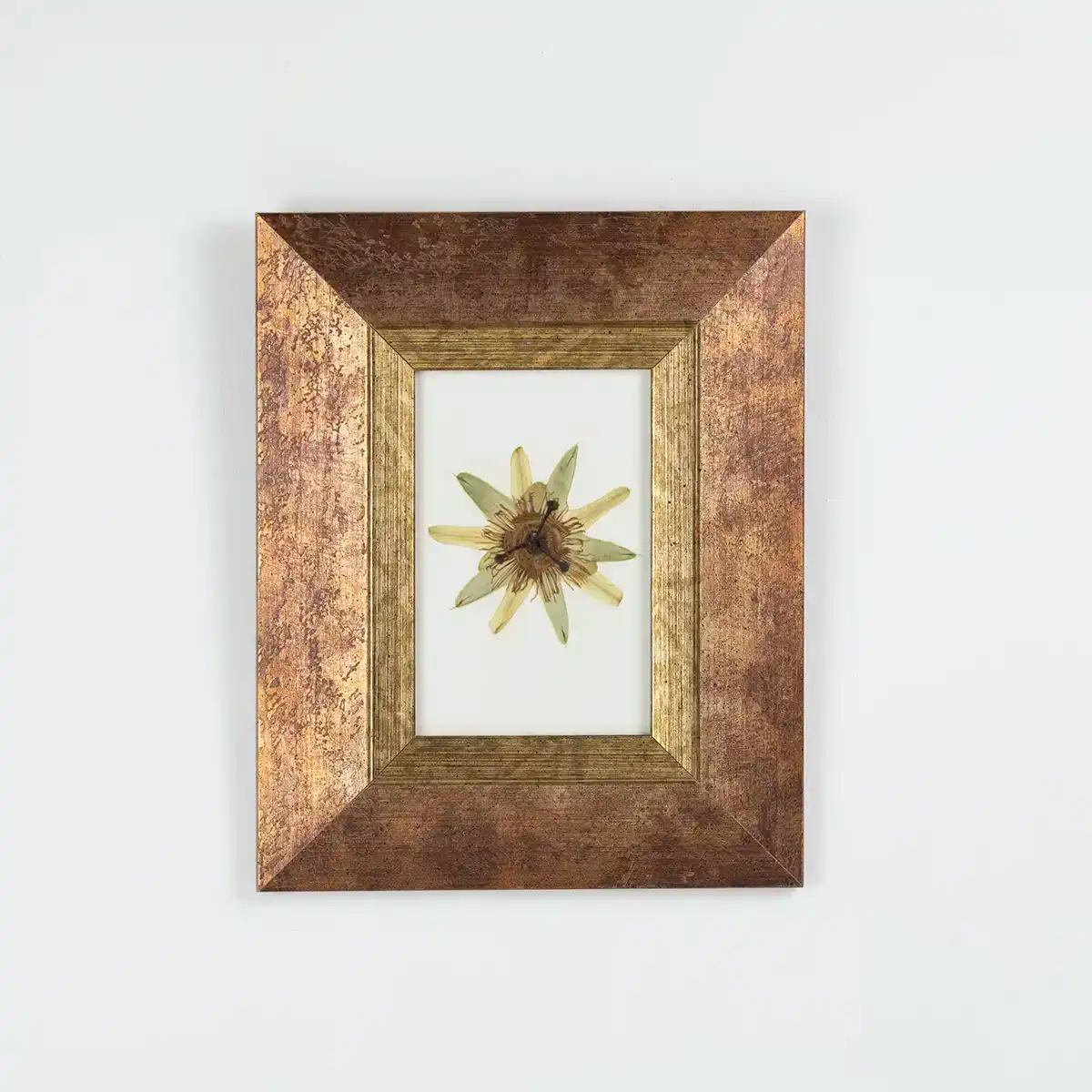 Flor de la pasión prensada con marco artístico en tonos cobre y dorado