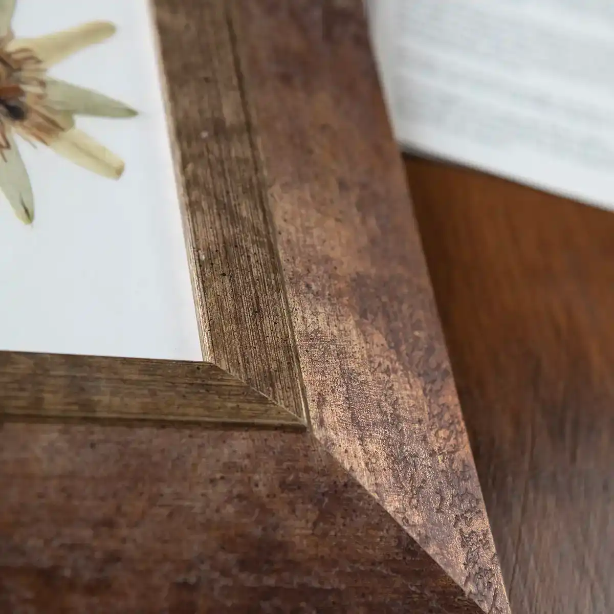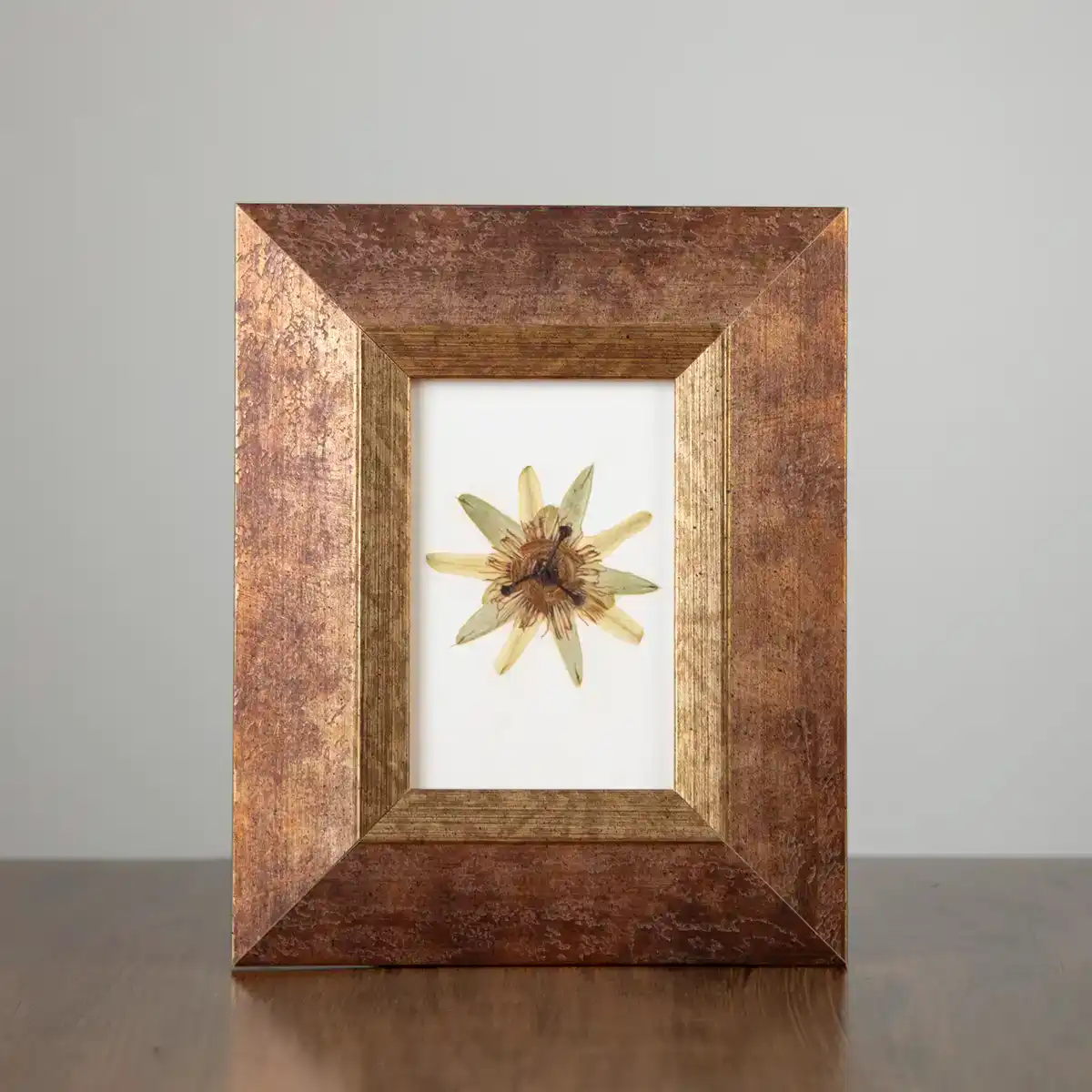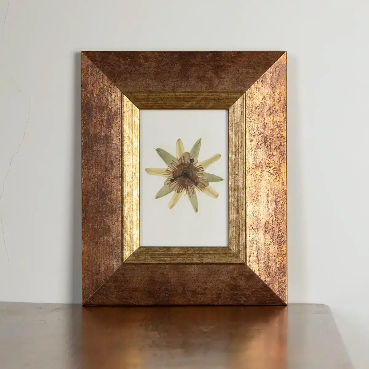 Flor de la pasión prensada con marco artístico en tonos cobre y dorado