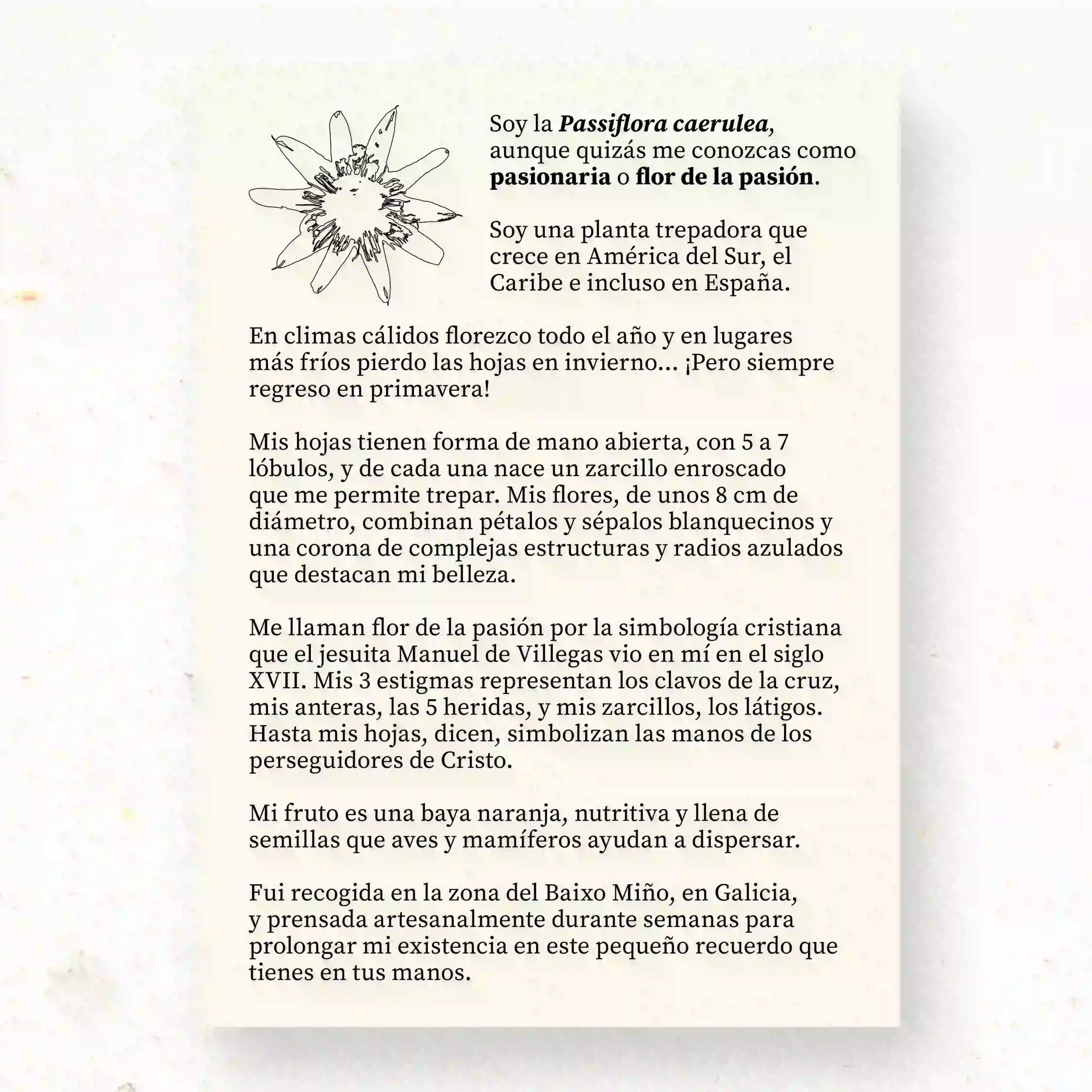 Obra botánica con flor prensada de Passiflora (flor de la pasión), dispuesta en el centro de la composición sobre cartulina de acuarela blanca libre de ácidos. Su forma simétrica y abierta recuerda a una estrella. Los pétalos, de tono crema verdoso, se disponen en espiral alrededor del centro, donde se adivinan los filamentos y la corona tan característicos de esta flor. Incluso prensada, conserva su fuerza simbólica y su estética casi mística.