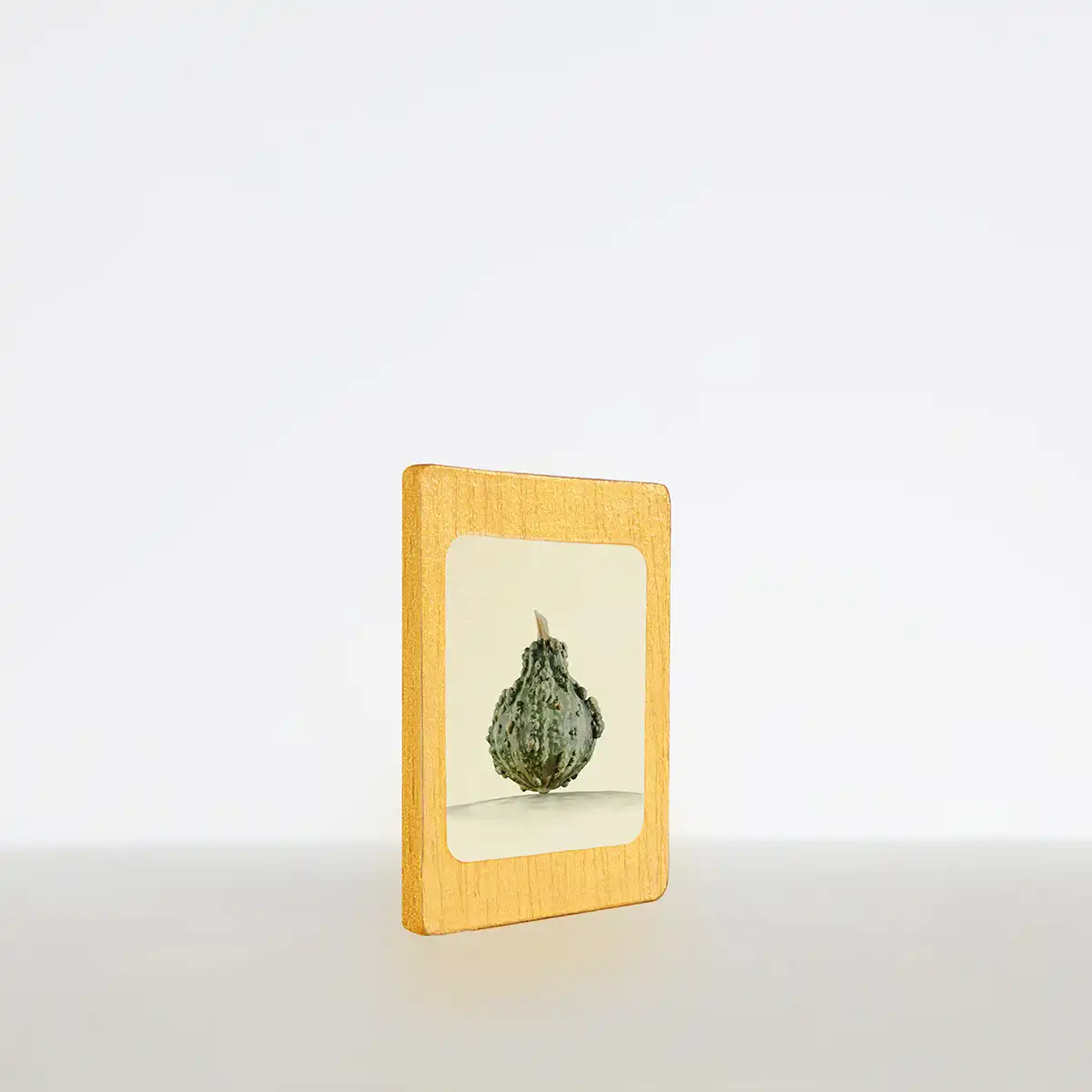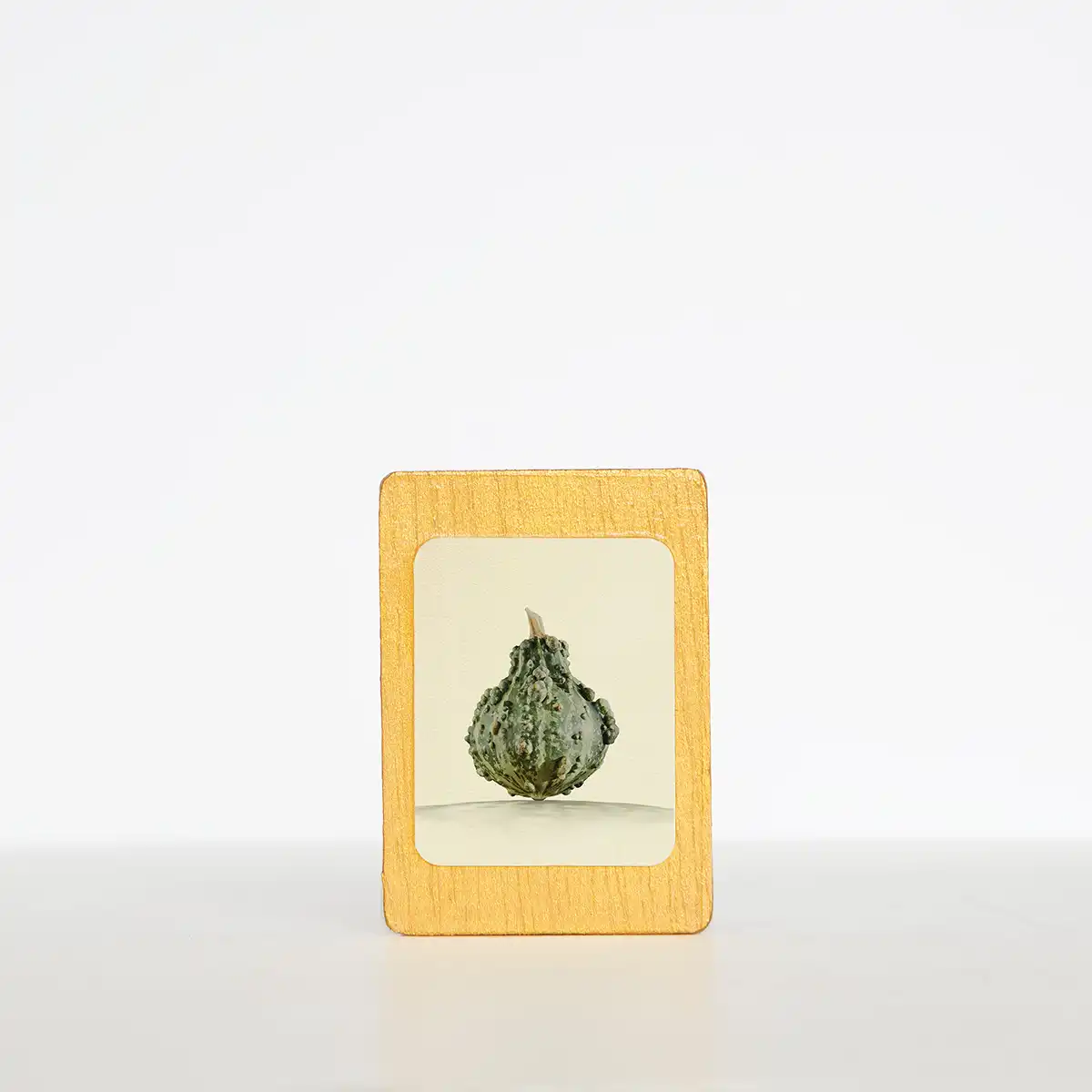 Imán decorativo de calabaza sobre madera con acabado dorado.