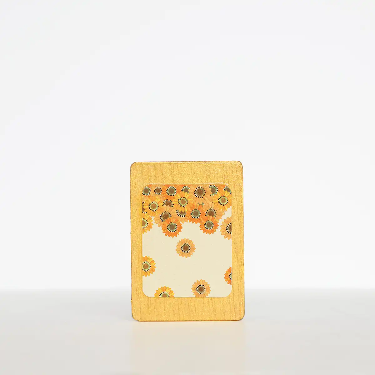 Imán girasoles amarillos cayendo sobre madera artesanal.