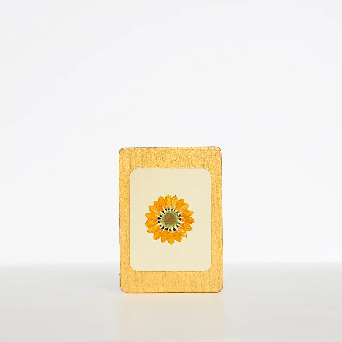 Imán de girasol amarillo sobre madera con acabado dorado.