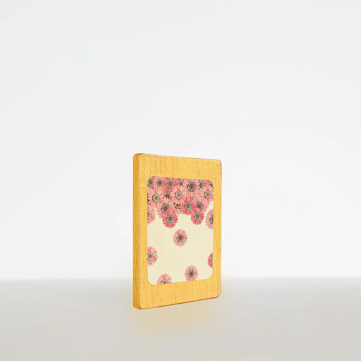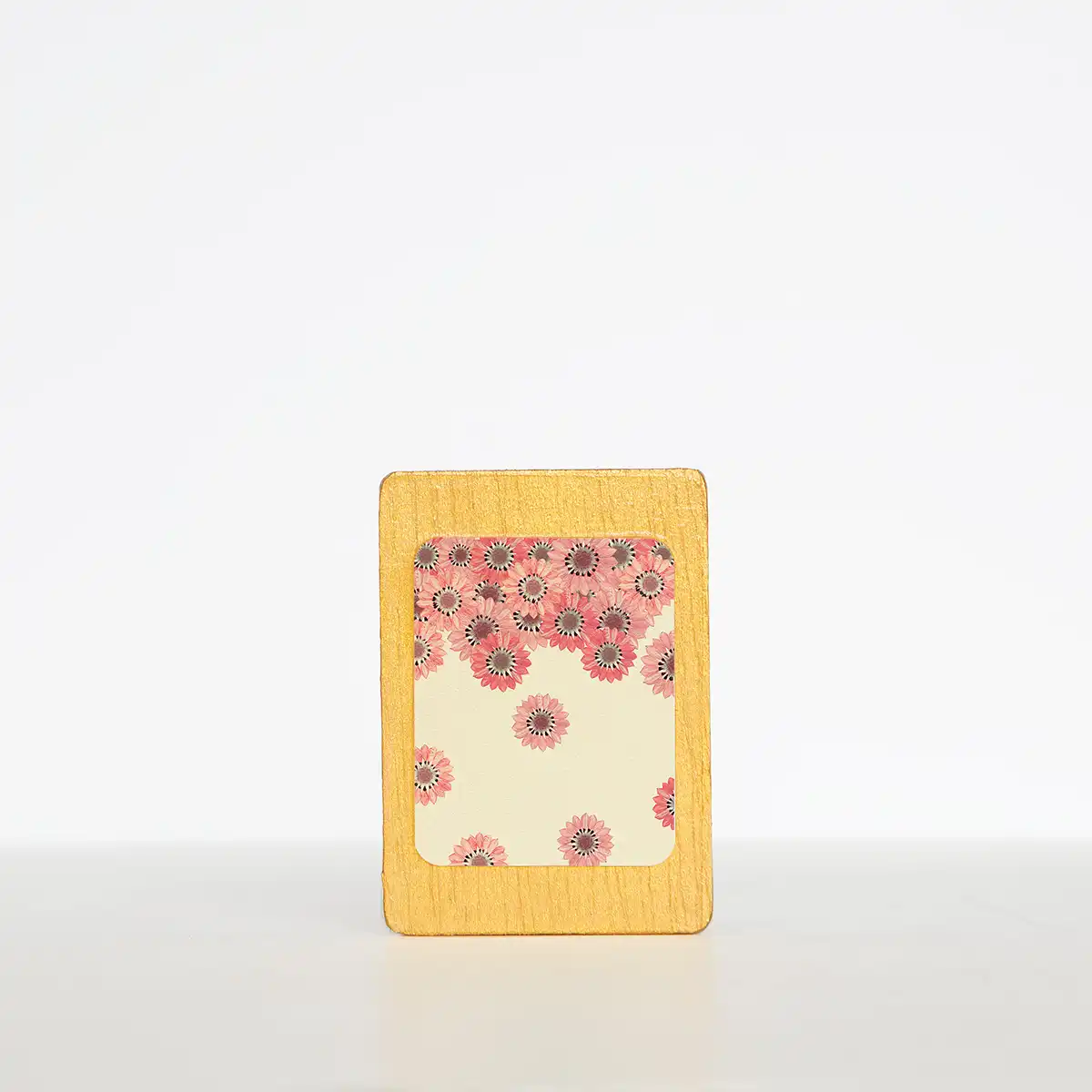 Imán de girasoles rosa en caída sobre madera dorada.