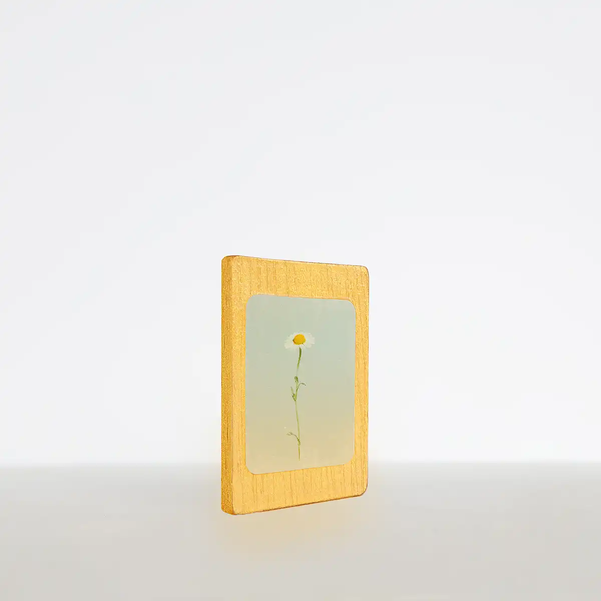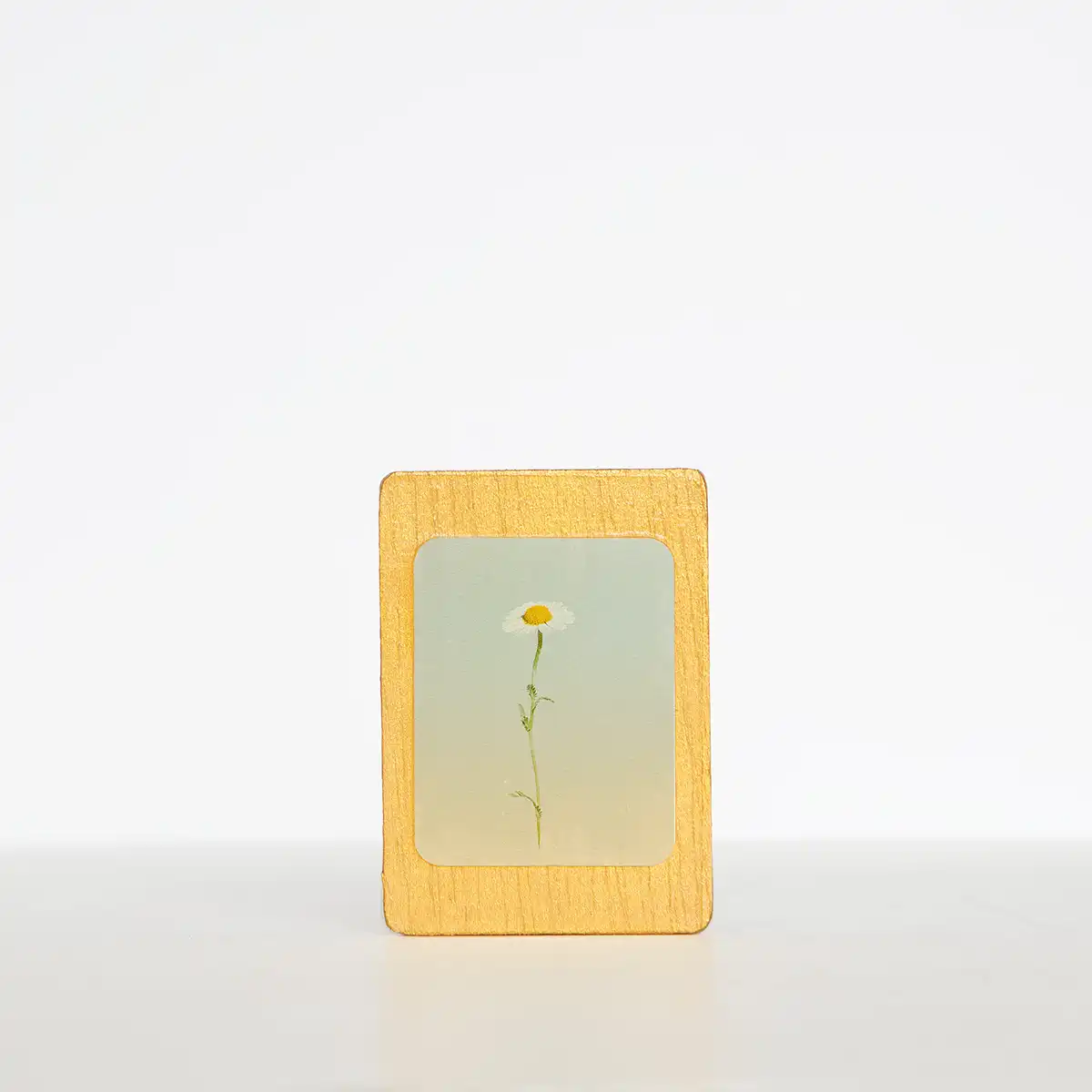 Imán ilustrado de manzanilla en madera decorativa vintage.