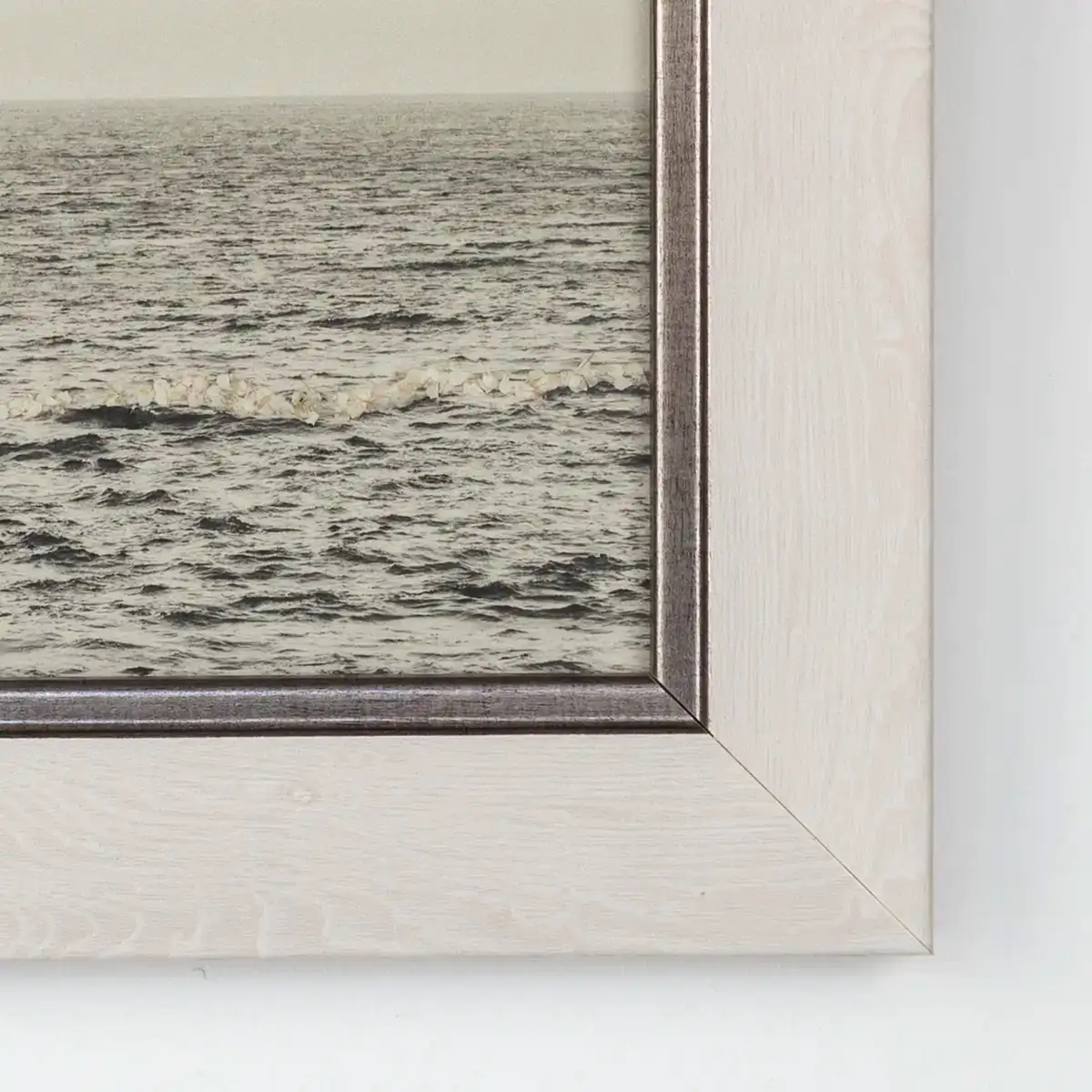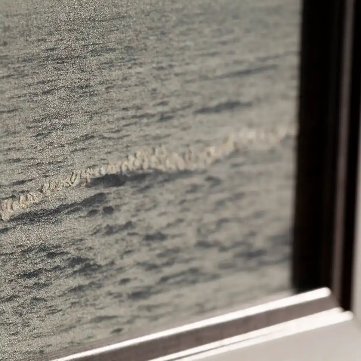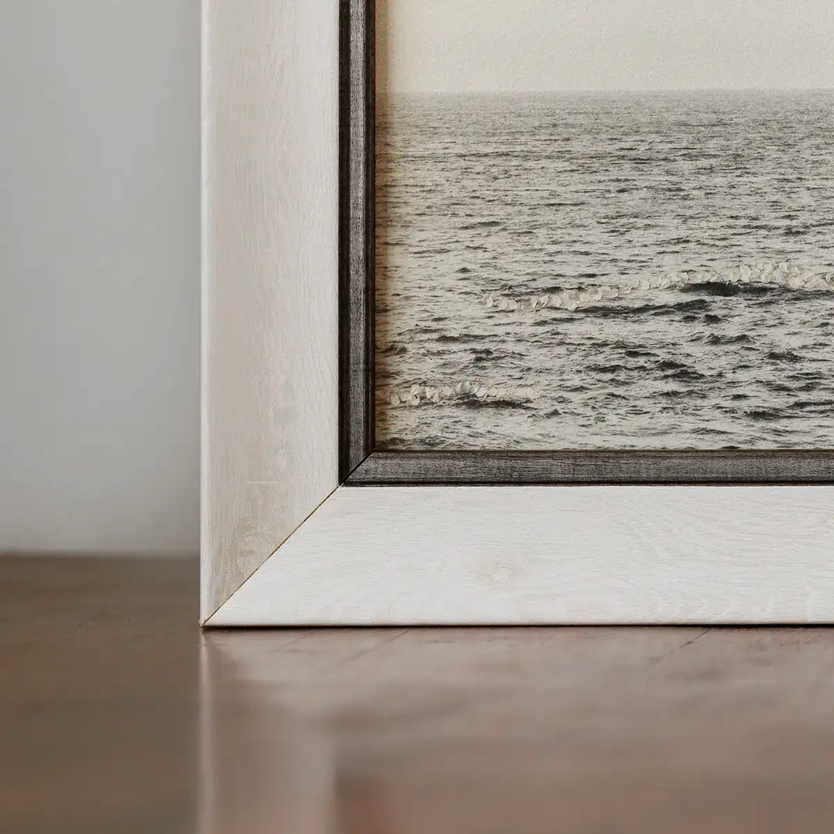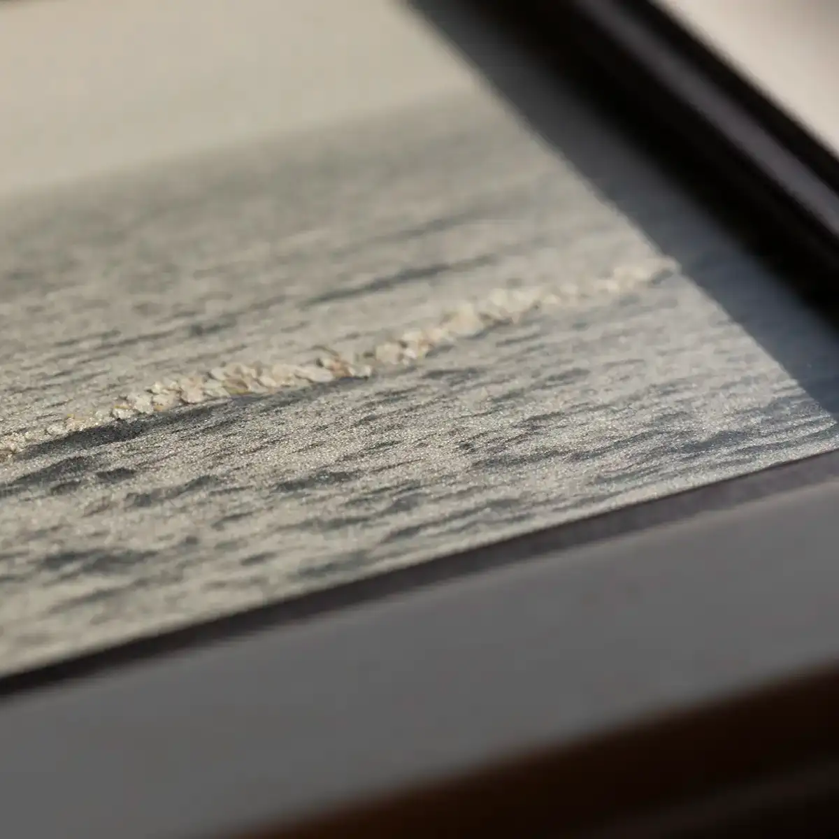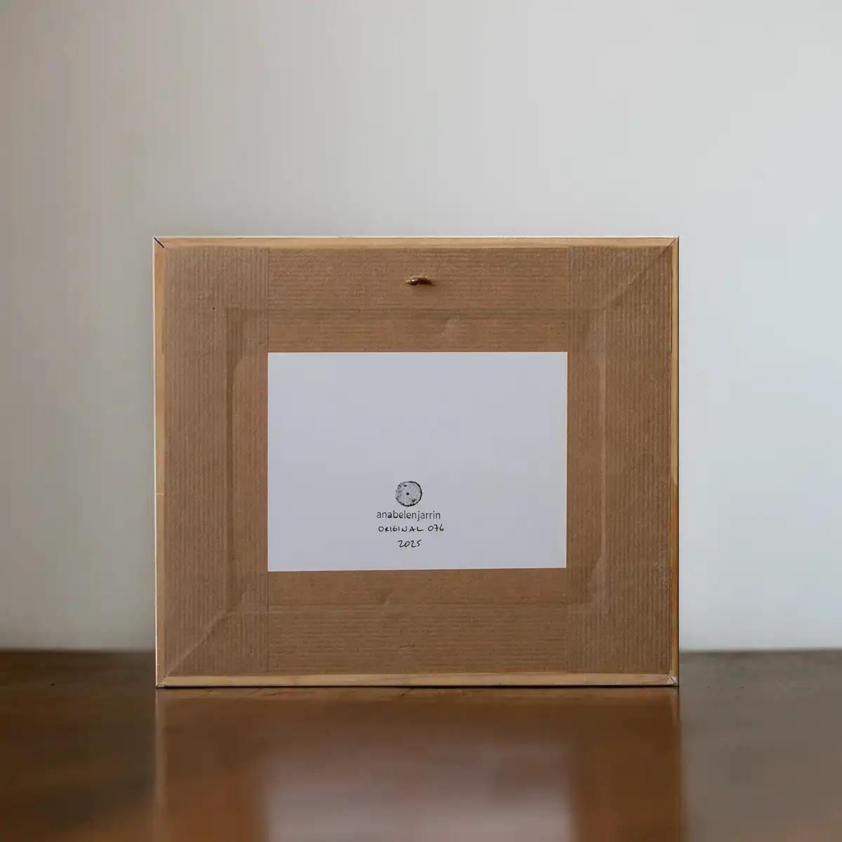 El marco, de madera clara con acabado artesanal, realza la sobriedad cromática y el carácter contemplativo de la pieza.