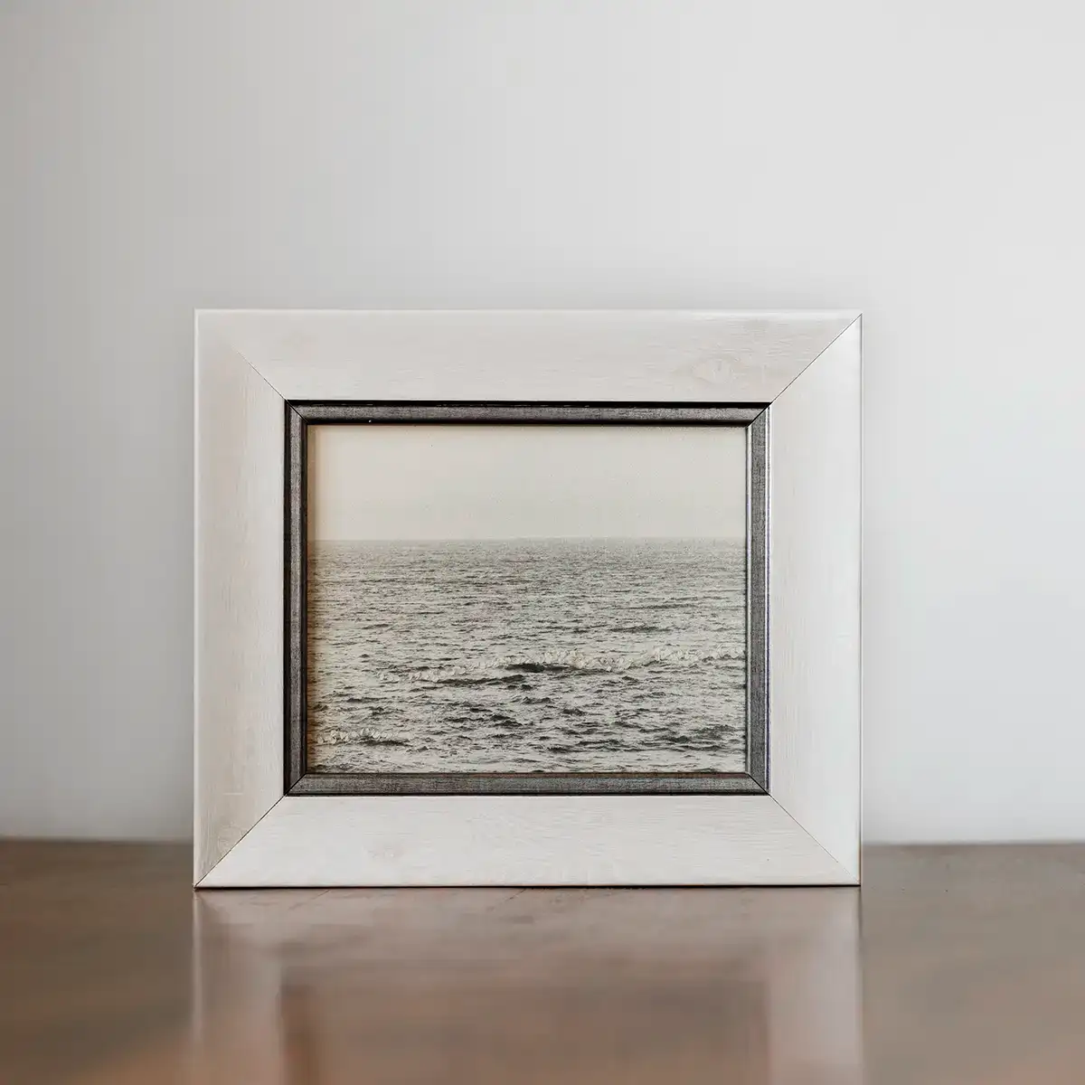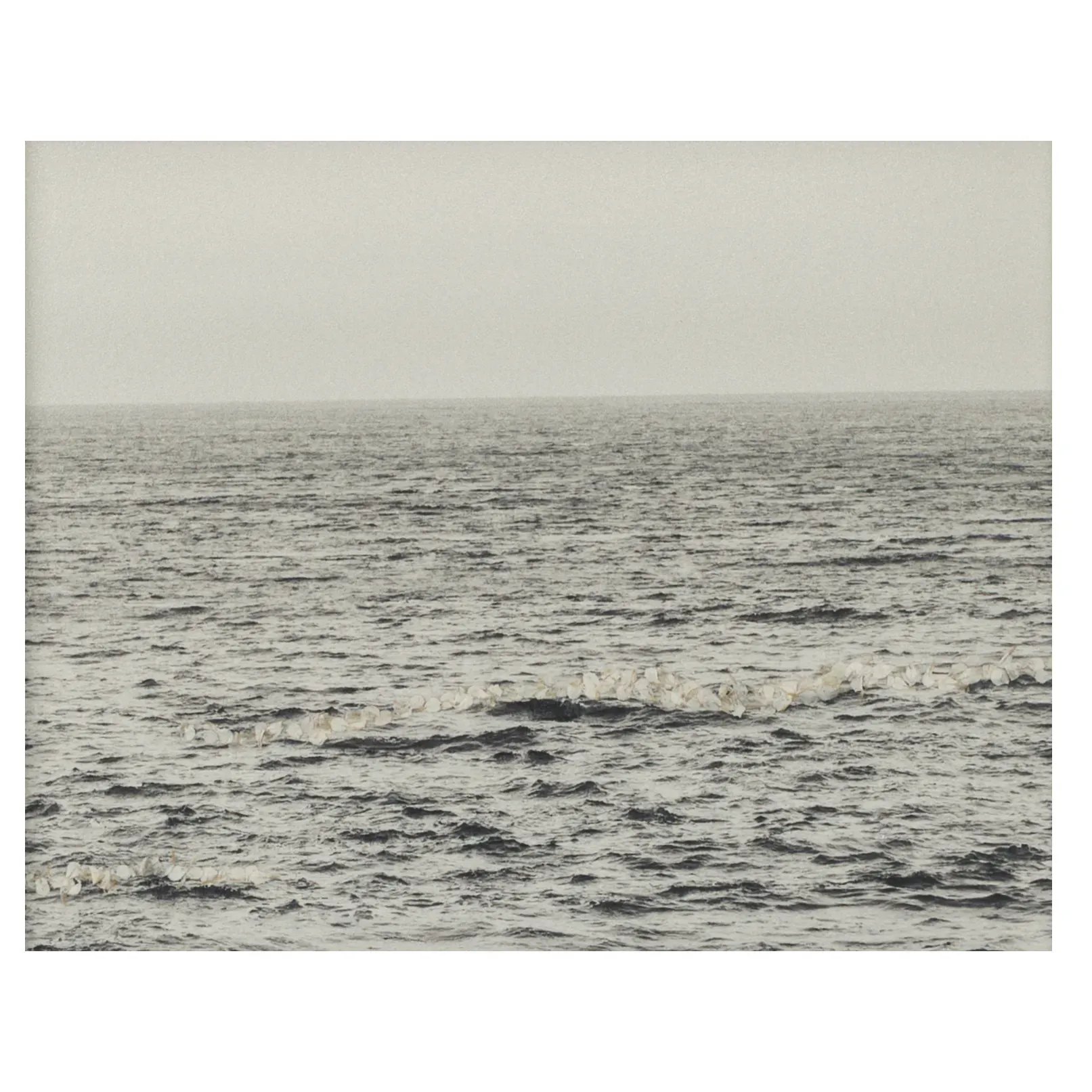 Fotografía artística del mar en tonos sepia, impresa en papel museo e intervenida con pétalos de flores prensadas reales.