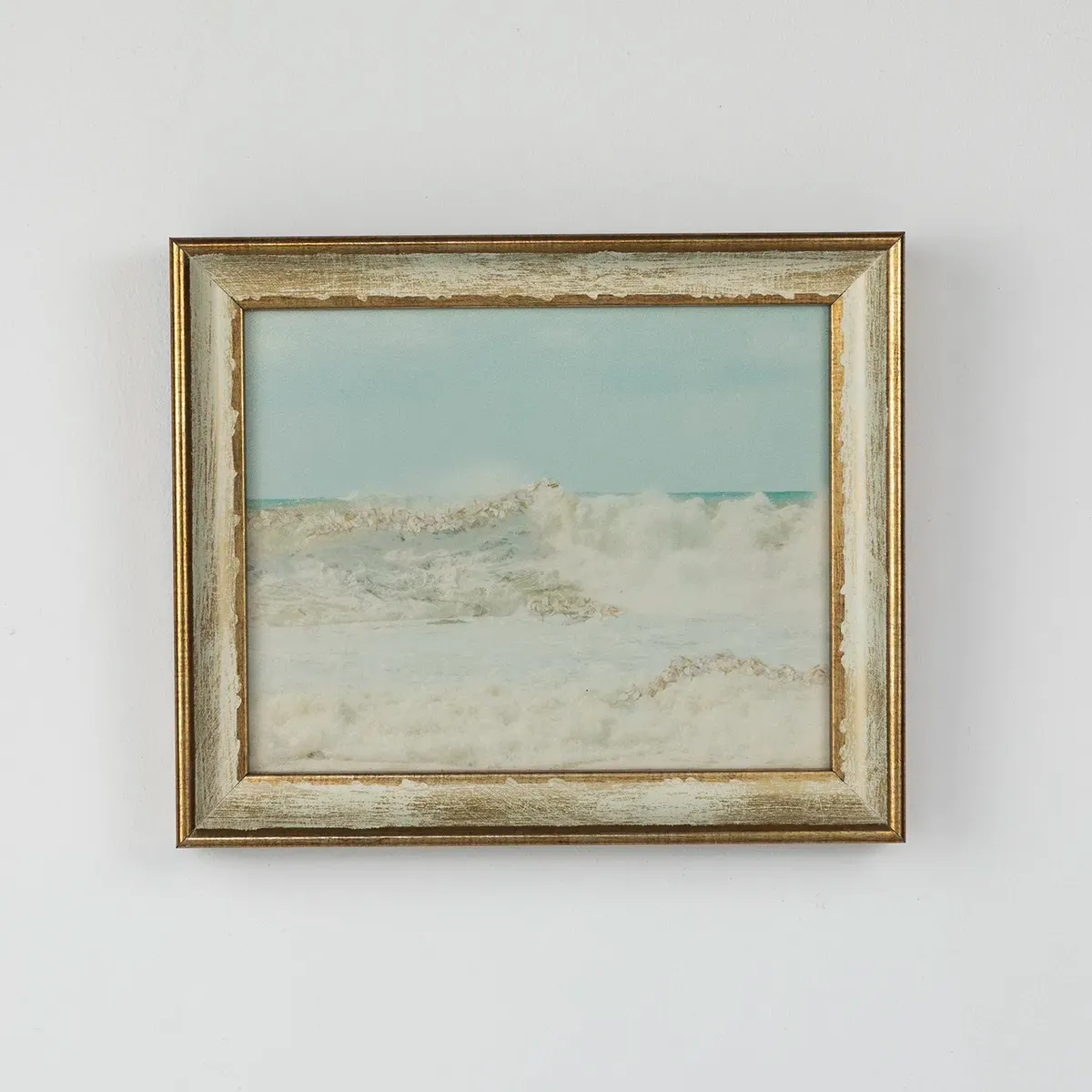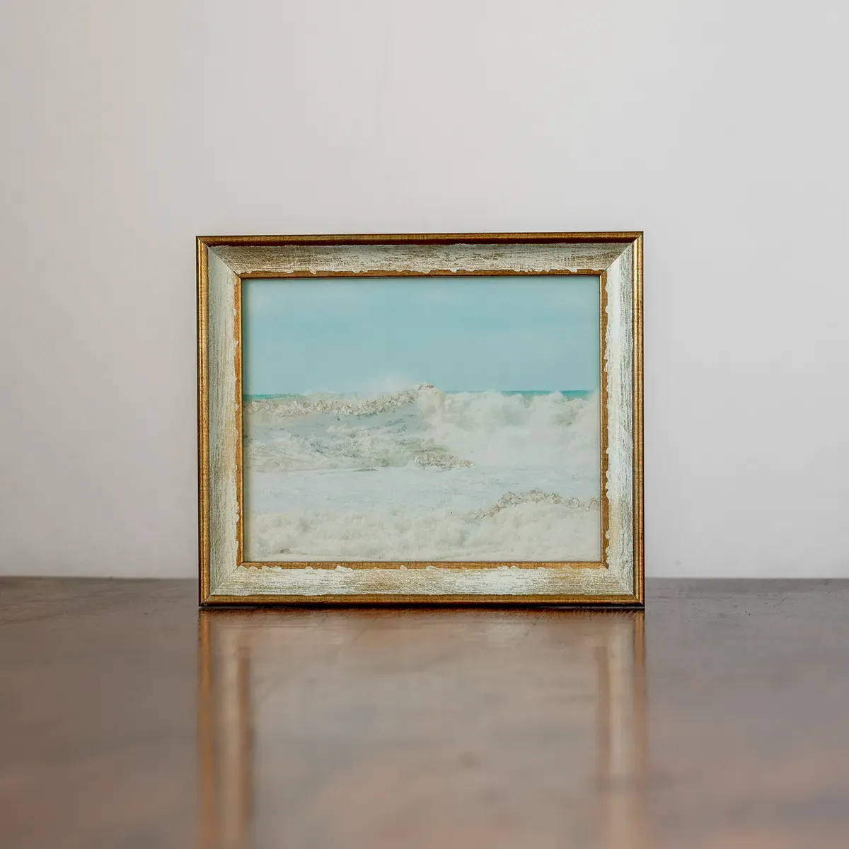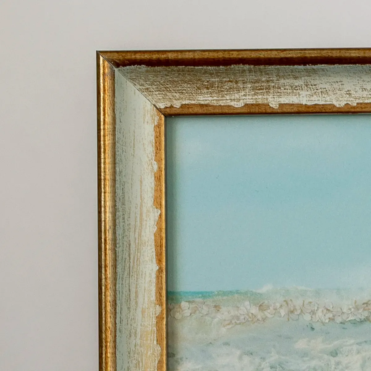 Fotografía de mar luminoso con pétalos naturales y marco dorado.