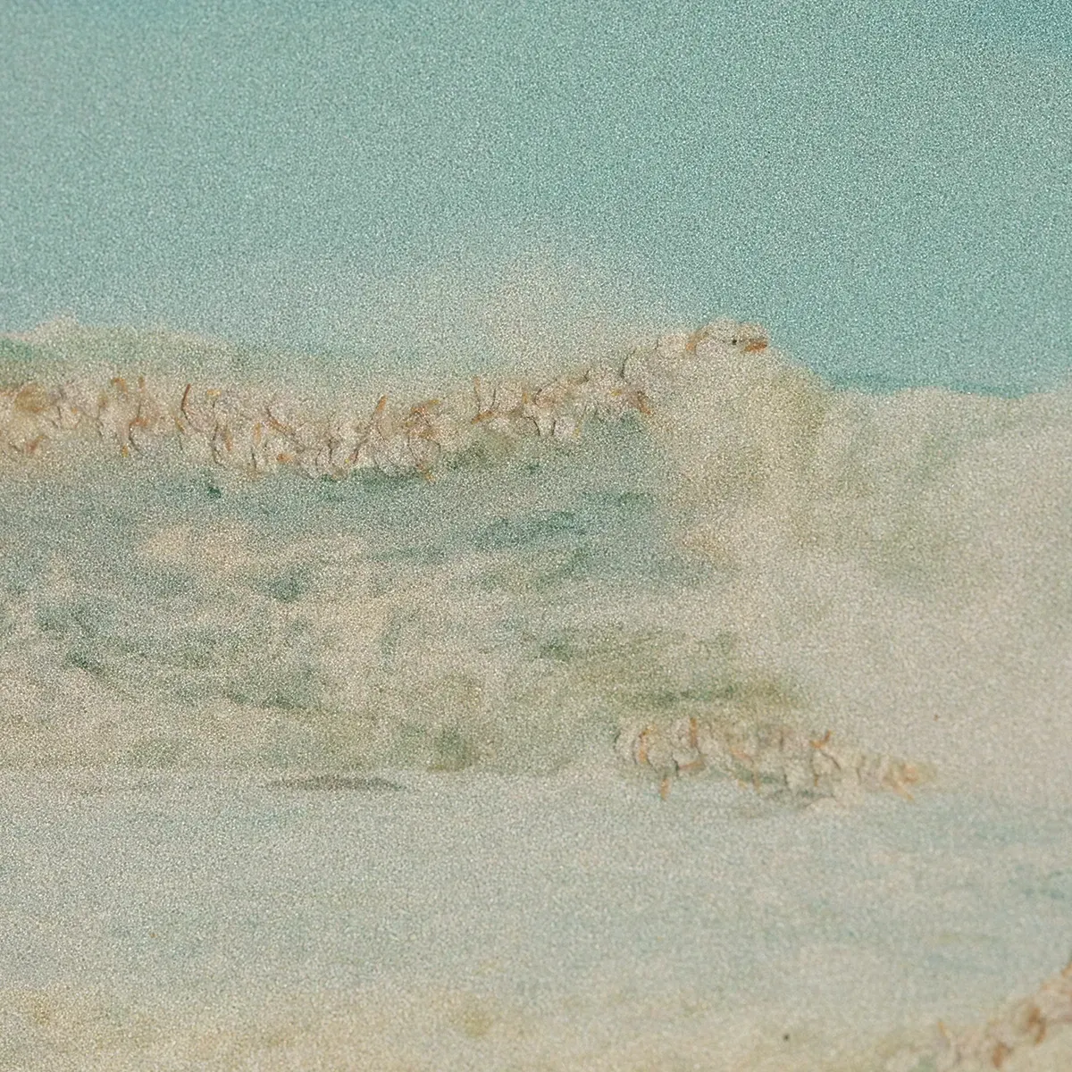 Fotografía del mar en tonos suaves, intervenida con pétalos reales prensados que emergen sobre el horizonte marino. La gama cromática —entre turquesa, crema y dorado envejecido— refleja la calma de un paisaje oceánico en equilibrio.