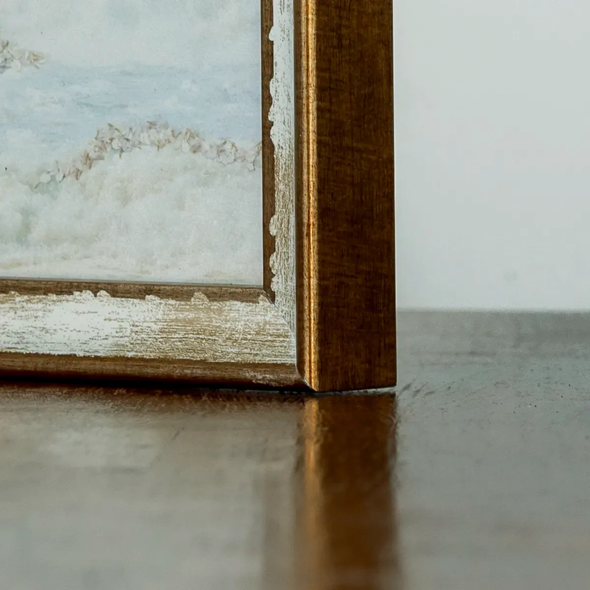 El marco dorado vintage, con pátina clara y textura irregular, aporta un aire poético y atemporal a la obra. Cada pieza se imprime en papel museo y se interviene a mano con flores recolectadas y prensadas artesanalmente.