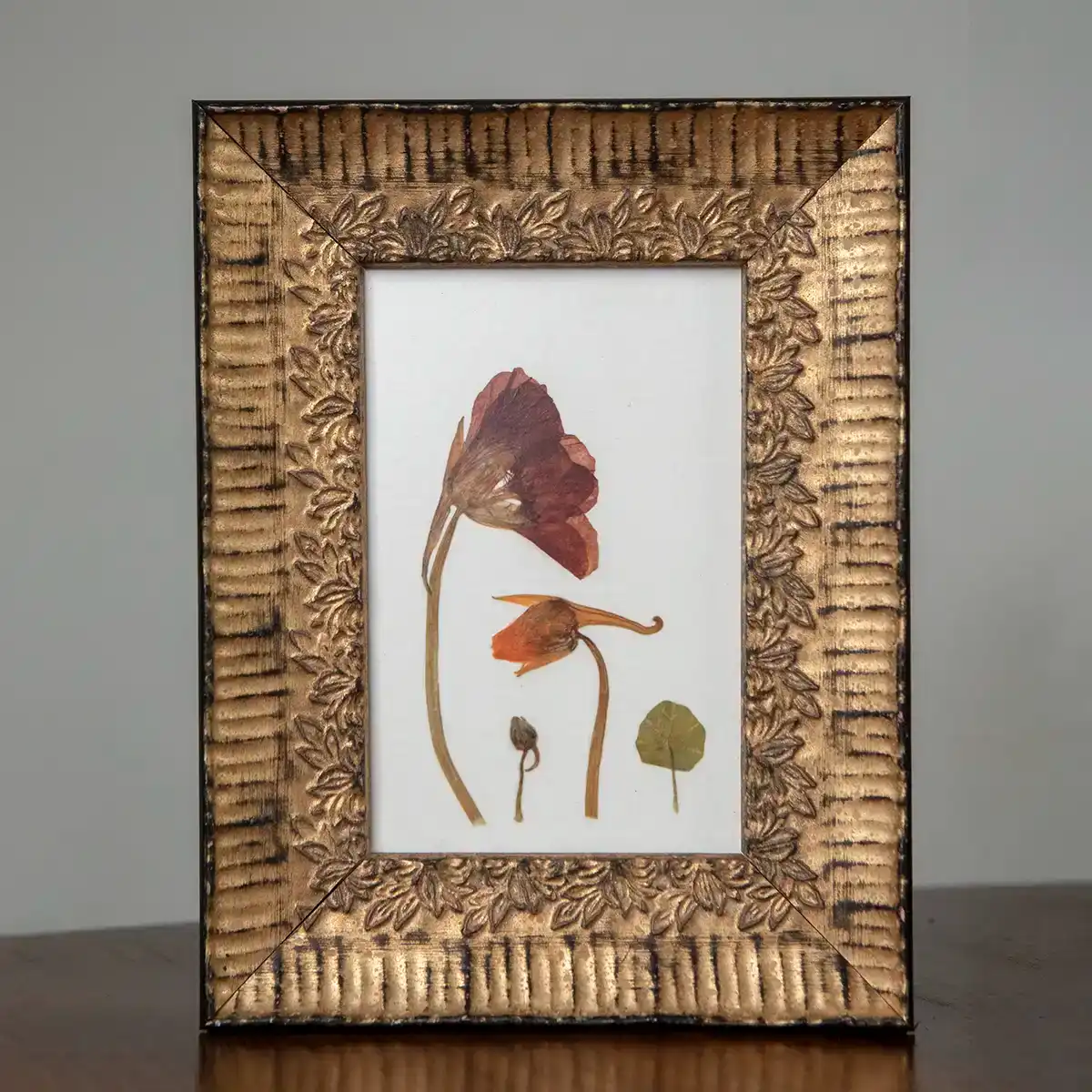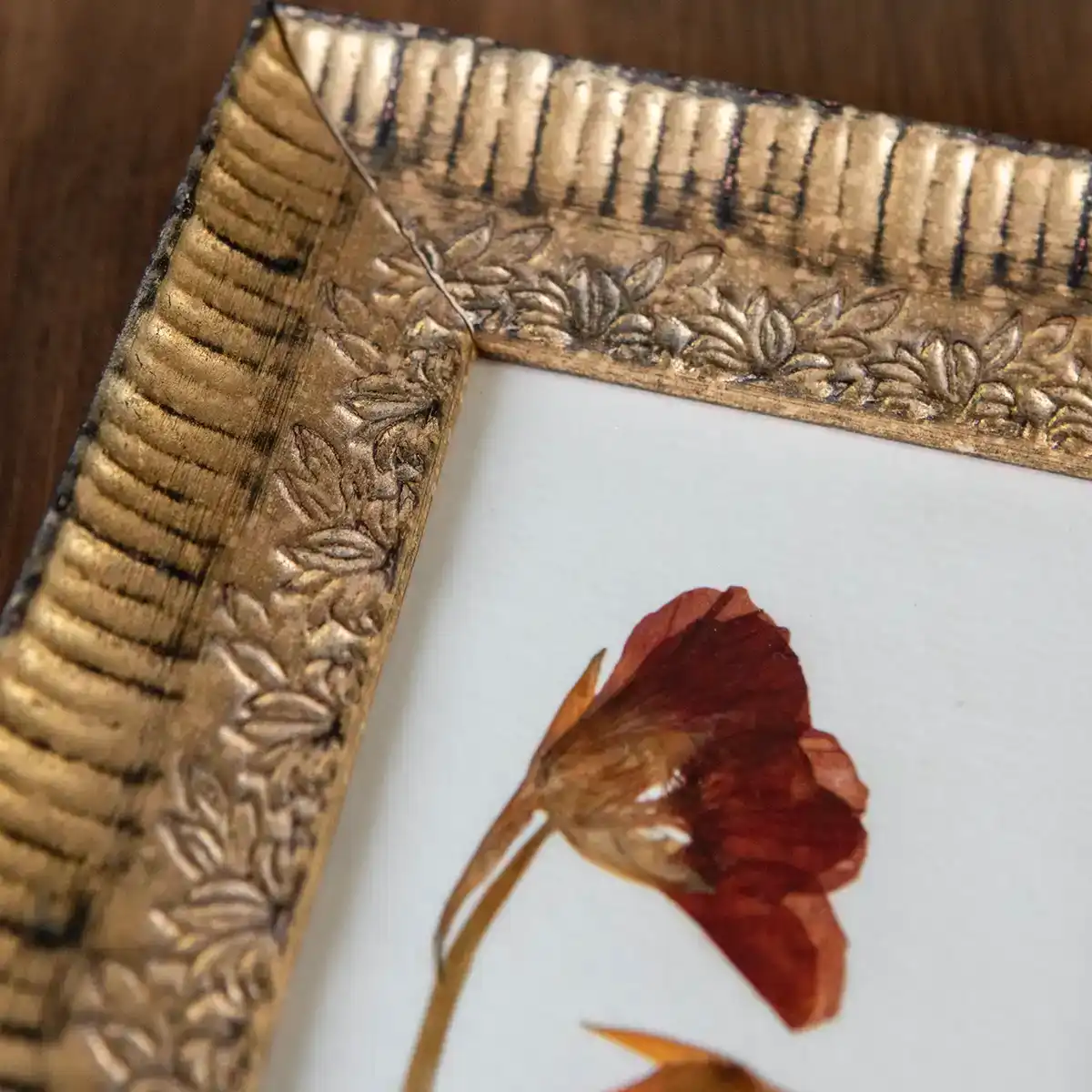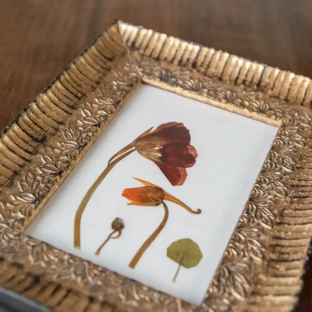 Obra botánica marco barroco con flores prensadas de capuchina, una planta ornamental y comestible reconocida por su forma redondeada y sus colores intensos. Recolectadas a mano, las flores han sido prensadas durante un periodo mínimo de cuatro semanas, utilizando presión continua y papel secante neutro, sin aditivos ni productos químicos.