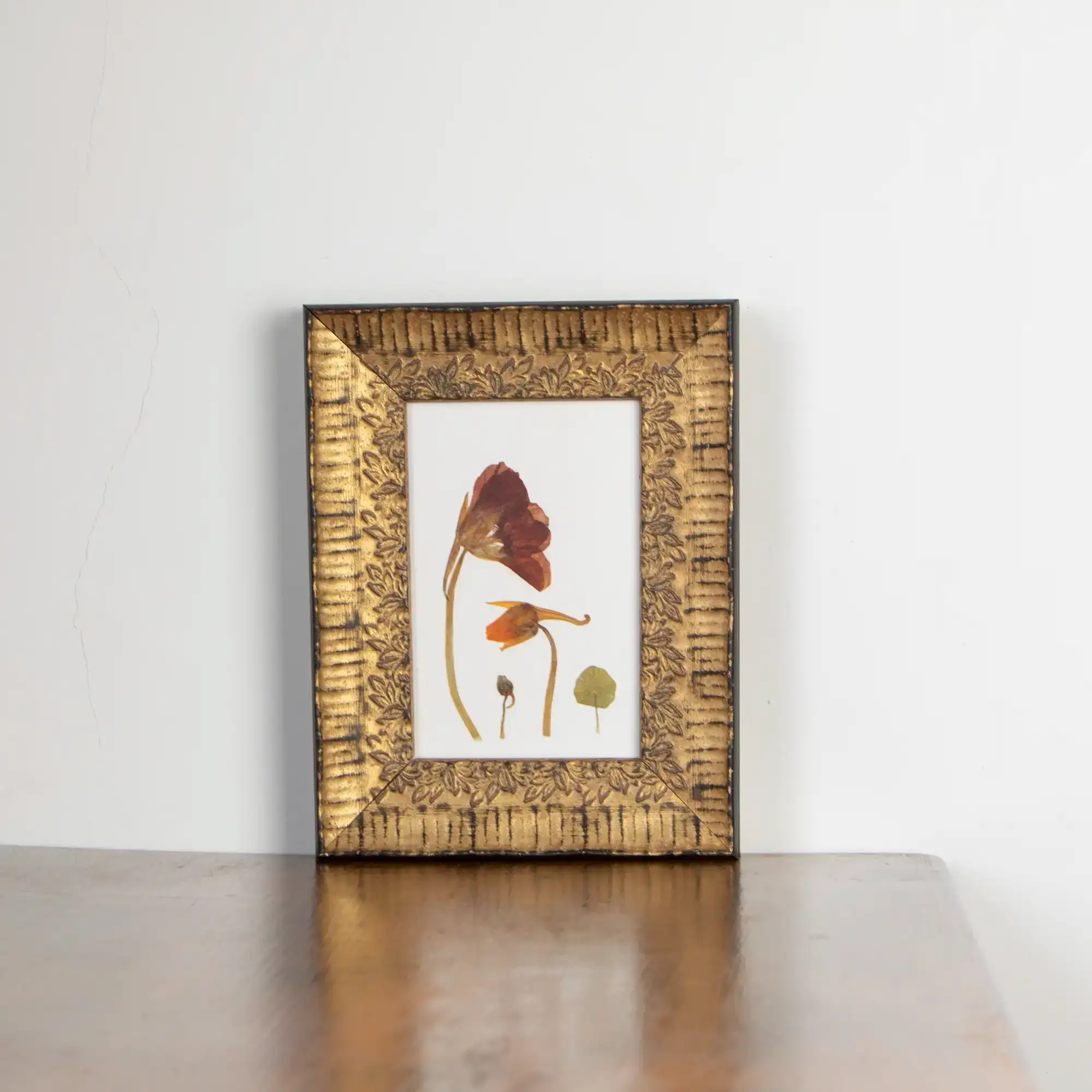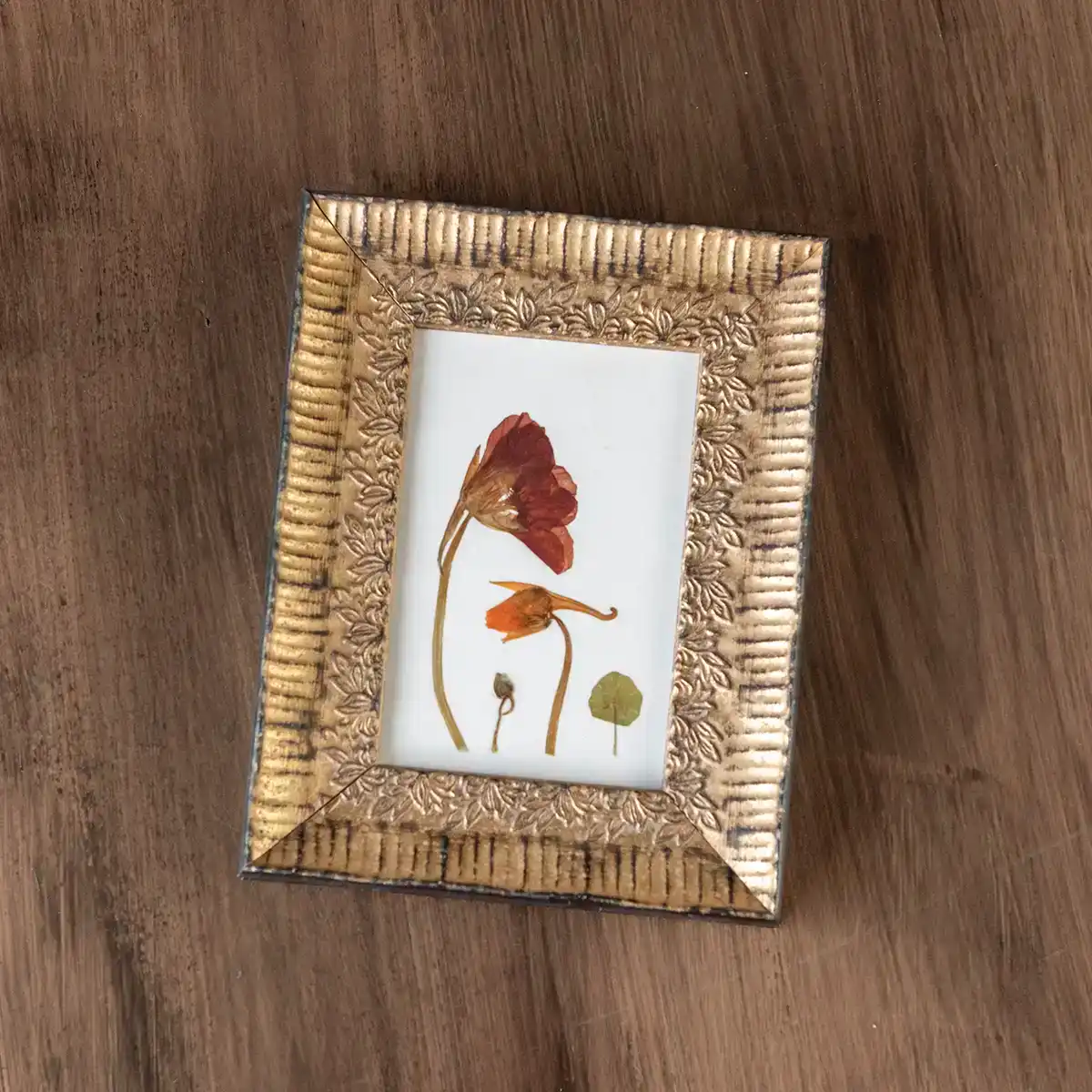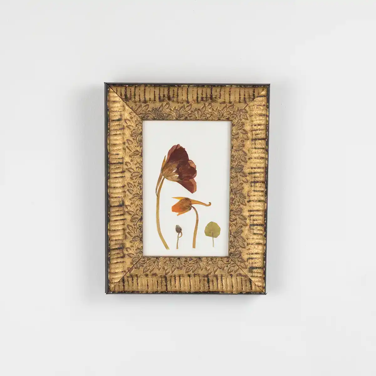 Obra botánica marco barroco con flores prensadas de capuchina, una planta ornamental y comestible reconocida por su forma redondeada y sus colores intensos. Recolectadas a mano, las flores han sido prensadas durante un periodo mínimo de cuatro semanas, utilizando presión continua y papel secante neutro, sin aditivos ni productos químicos.