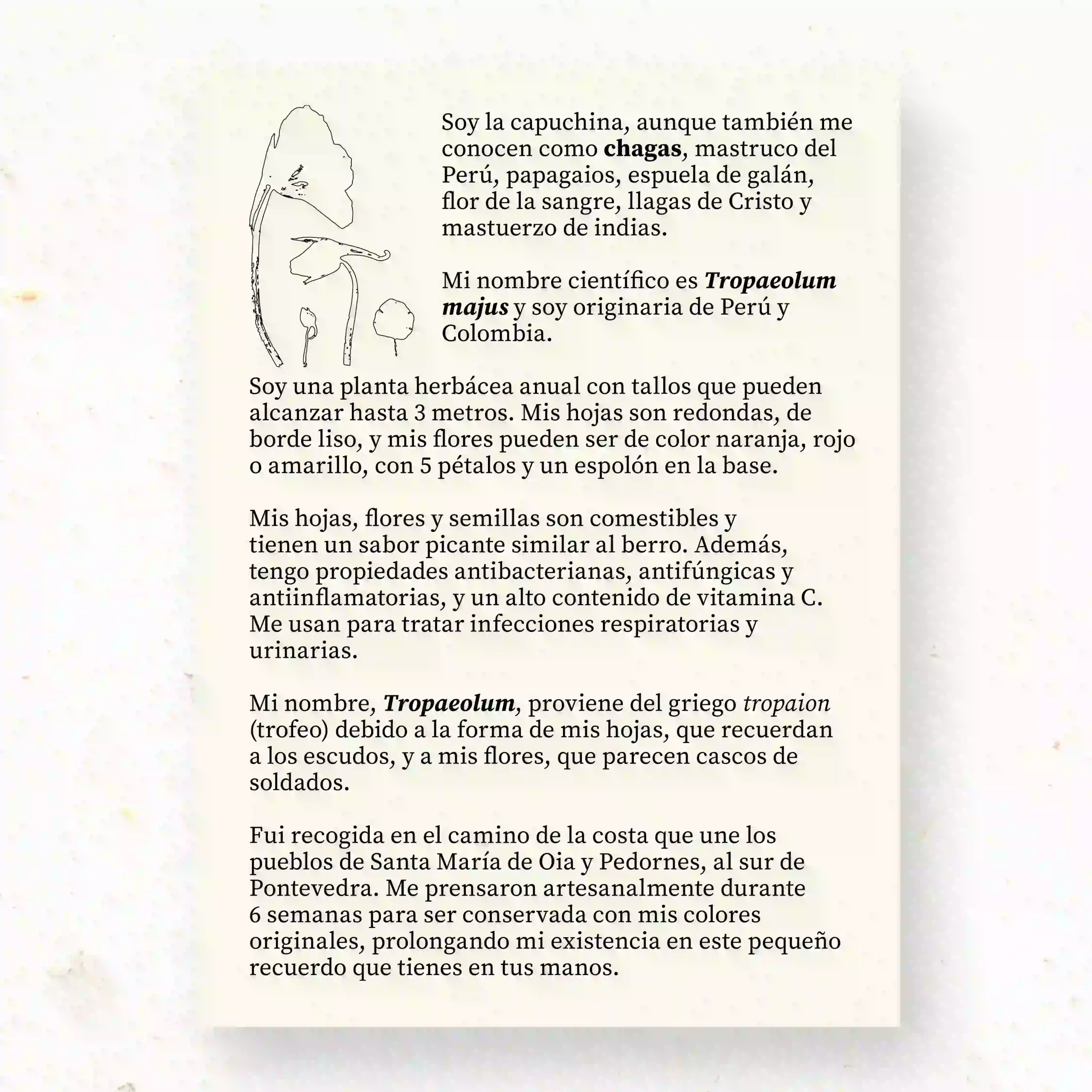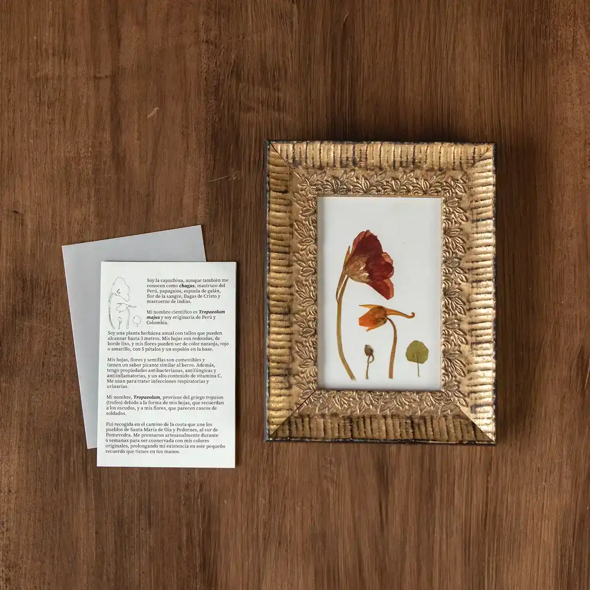 El prensado conserva sus tonalidades naturales: rojos y naranjas que derivan en matices ocres y cobrizos, fruto del proceso de secado. La hoja, también prensada, mantiene su forma redonda característica y un tono verde seco que aporta contraste visual. La base es una cartulina de acuarela blanca, libre de ácidos, elegida por su textura y por su capacidad para respetar el color original de los pétalos.