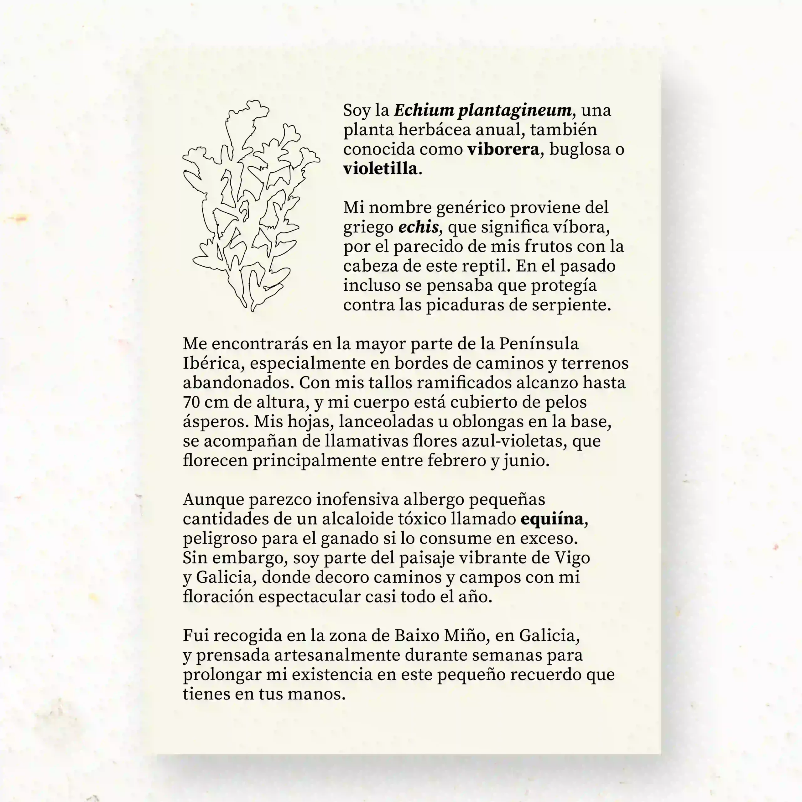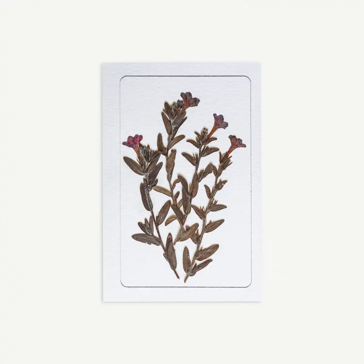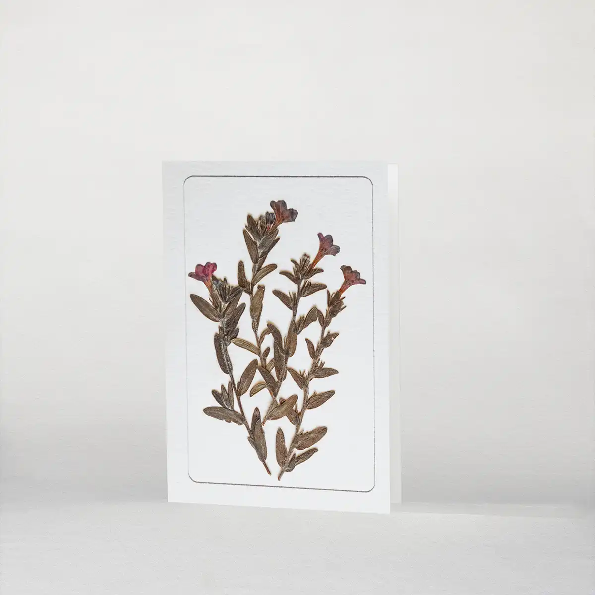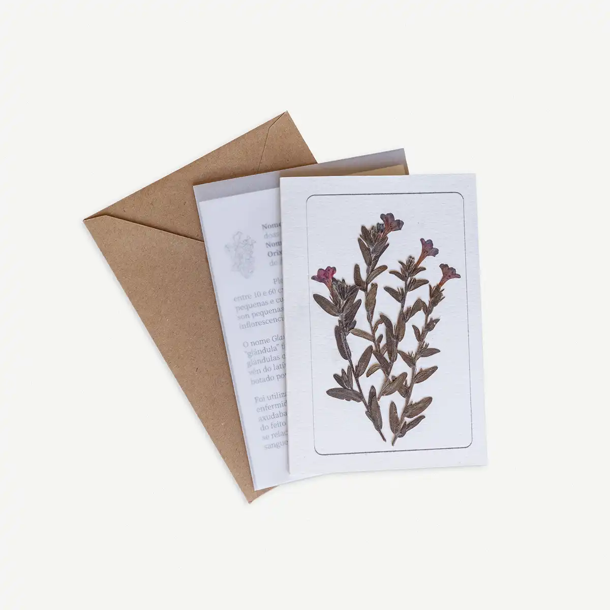 Tarjeta botánica con flor prensada sobre papel texturizado (Carqueixa)