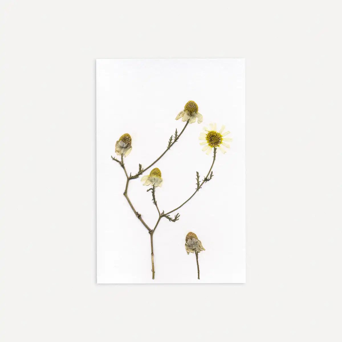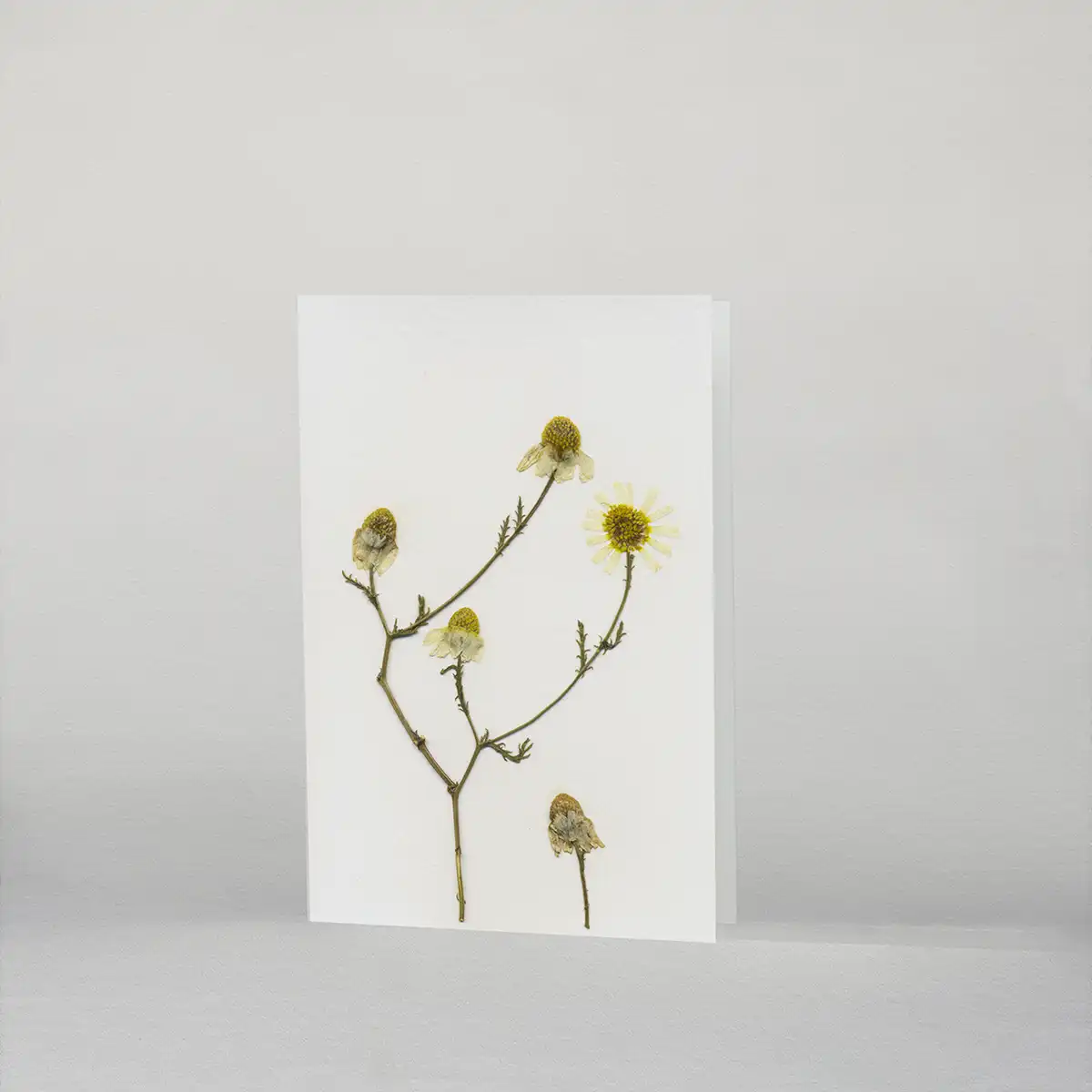 Tarjeta botánica hecha a mano con margarita silvestre prensada, montada sobre papel de algodón libre de ácidos. Esta pieza sencilla y serena evoca un pequeño jardín contenido en una hoja, donde la flor conserva su frescura y forma gracias a un prensado lento y cuidadoso.