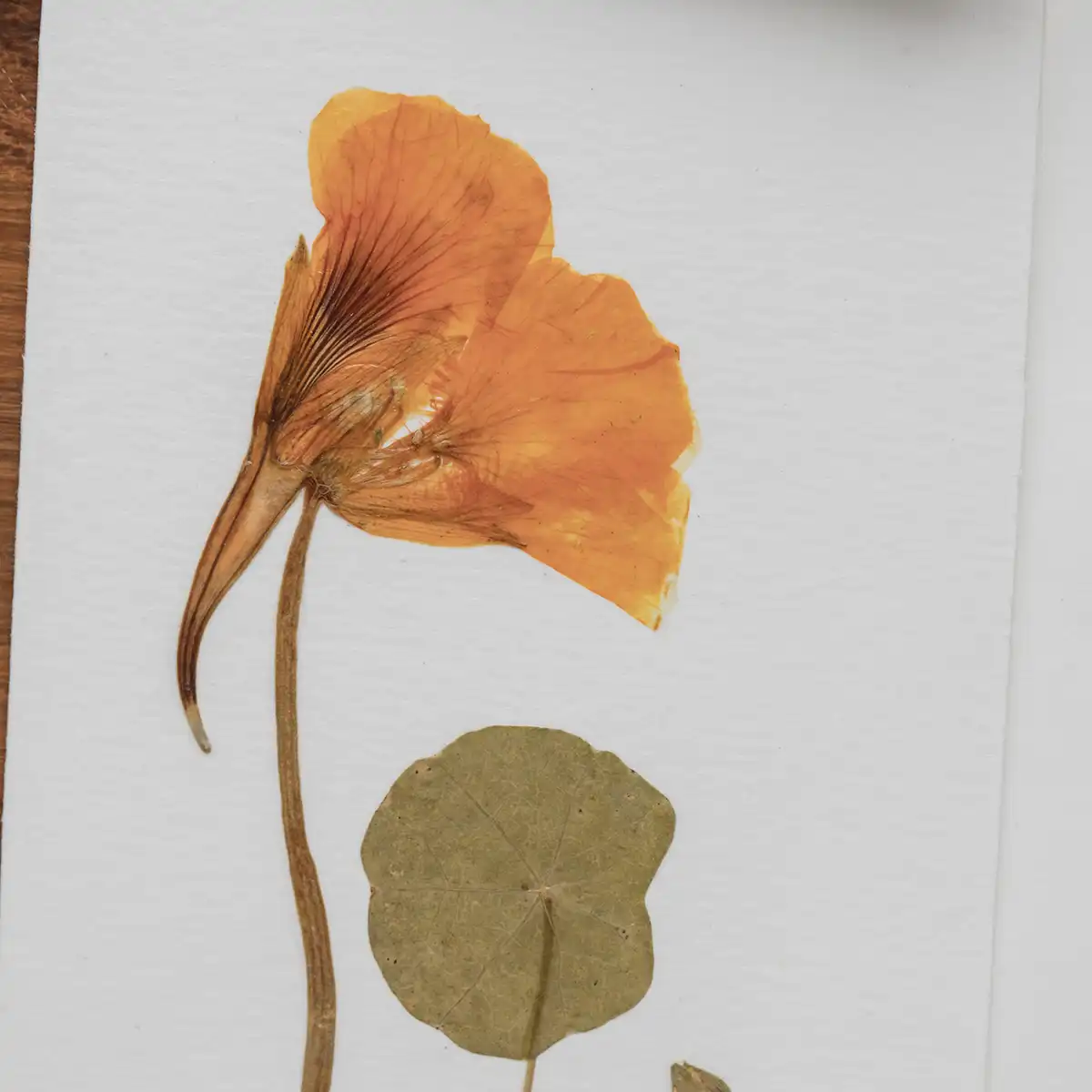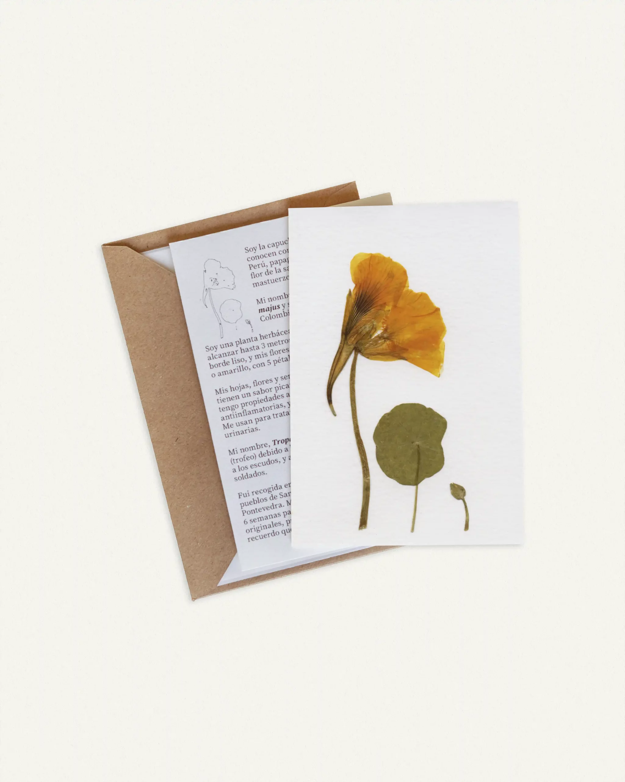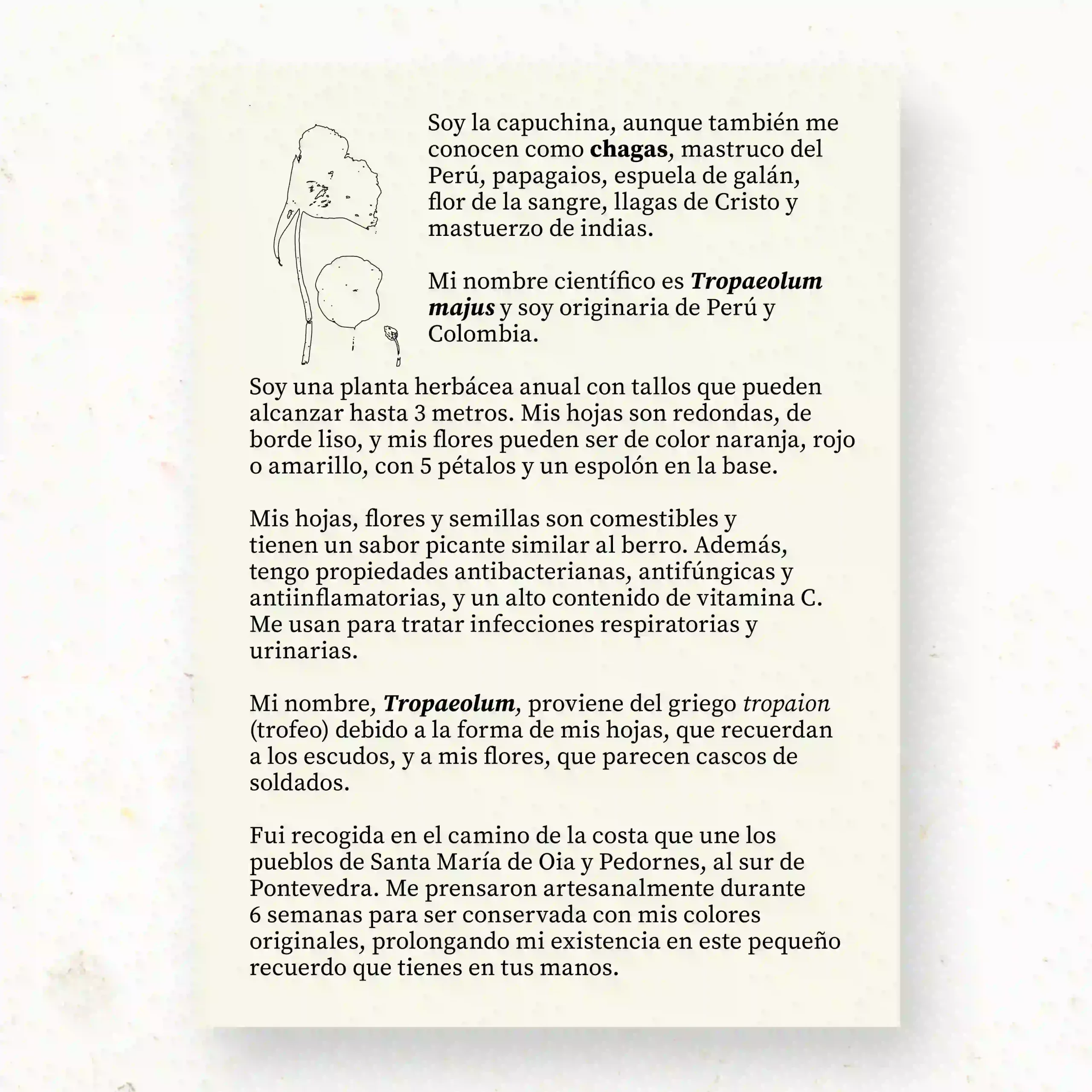 Tarjeta botánica artesanal con flor prensada de capuchina (Tropaeolum majus), recolectada a mano en Galicia y preservada mediante prensado lento, sin productos químicos. Esta flor destaca por la forma curvada de su tallo y la intensidad de su color naranja rojizo, que se mantiene gracias al uso de papel secante neutro y presión controlada durante varias semanas.