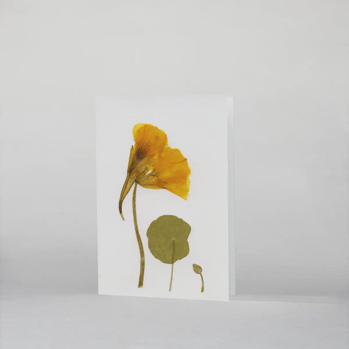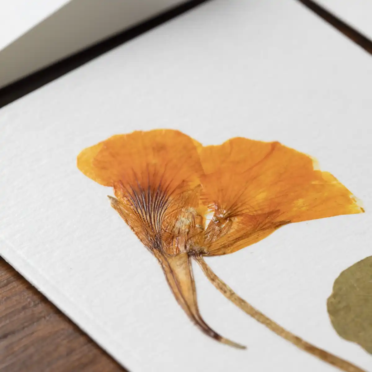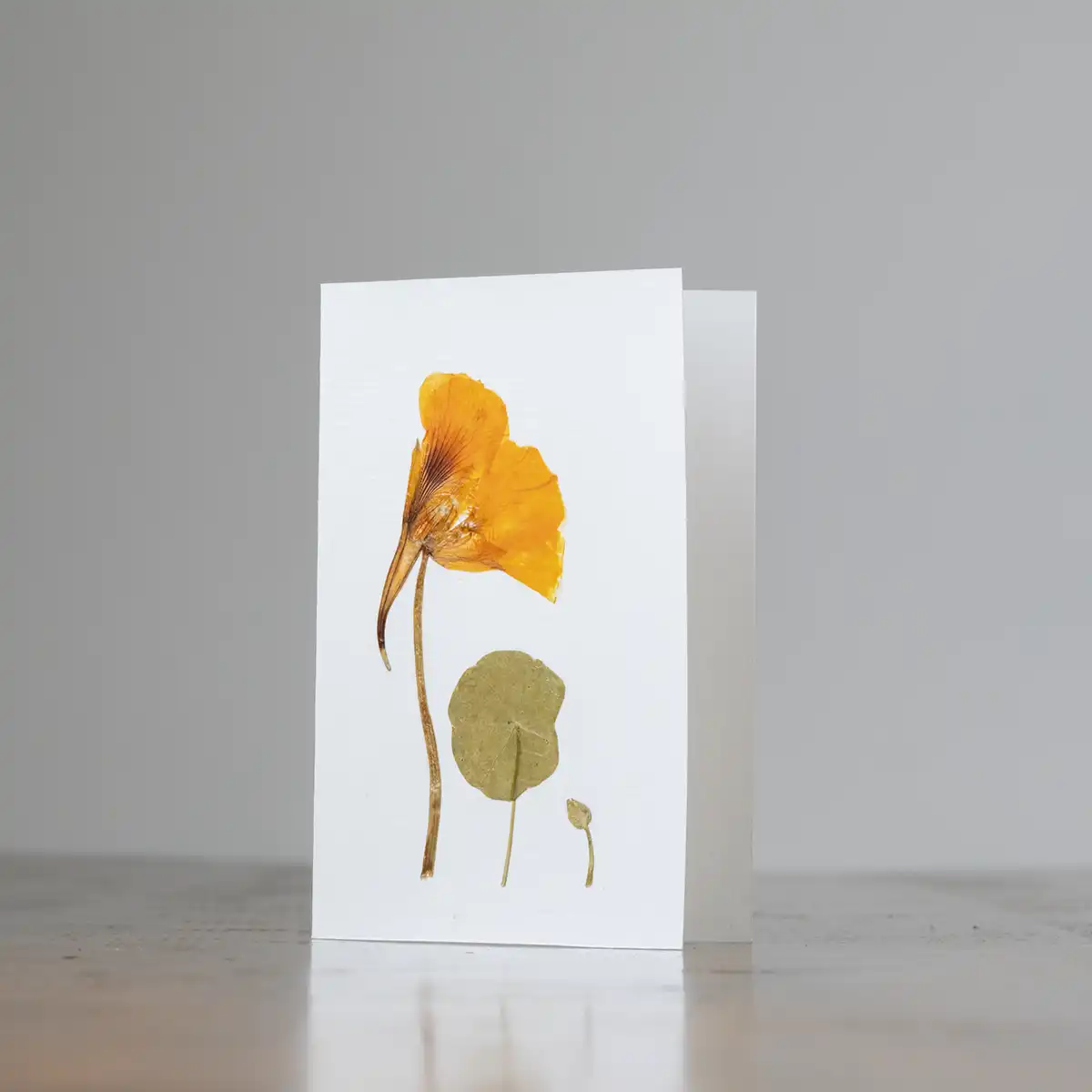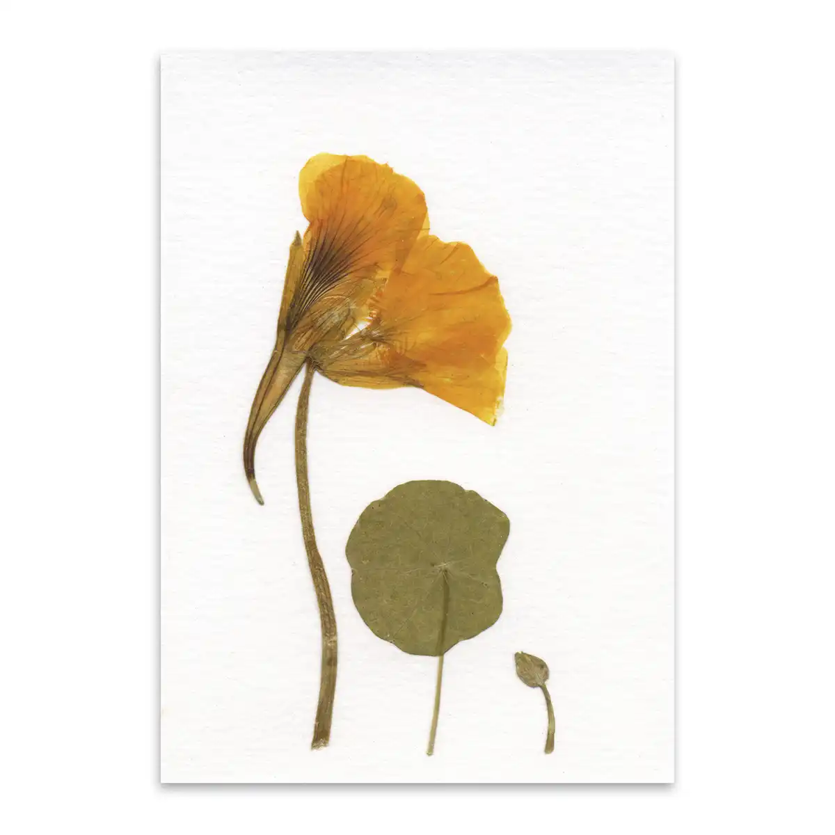 Tarjeta botánica artesanal con flor prensada de capuchina (Tropaeolum majus), recolectada a mano en Galicia y preservada mediante prensado lento, sin productos químicos. Esta flor destaca por la forma curvada de su tallo y la intensidad de su color naranja rojizo, que se mantiene gracias al uso de papel secante neutro y presión controlada durante varias semanas.