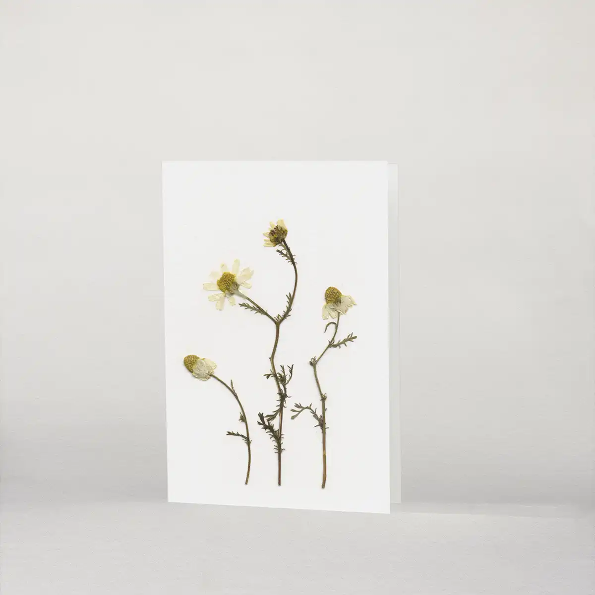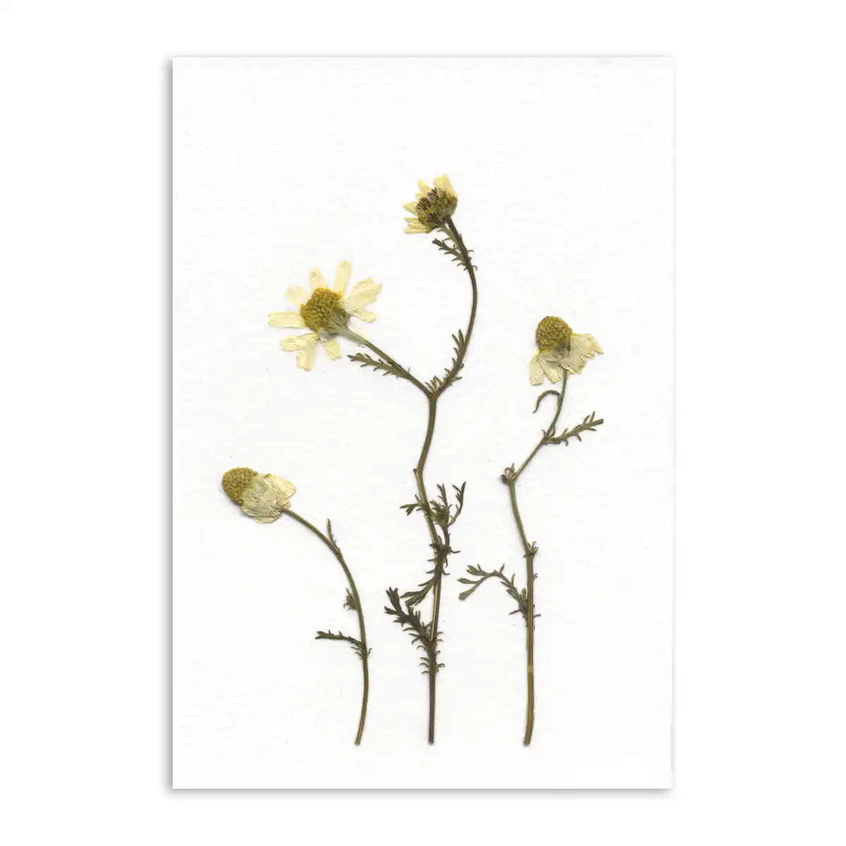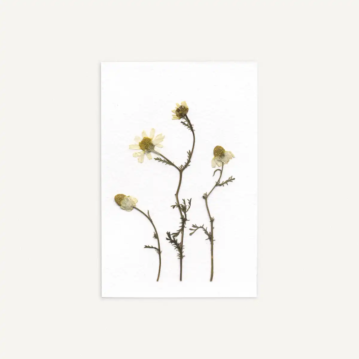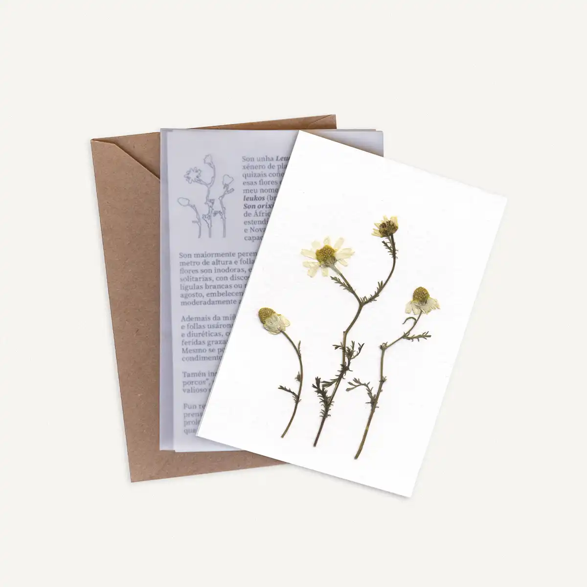 Tarjeta botánica artesanal con flores prensadas de manzanilla