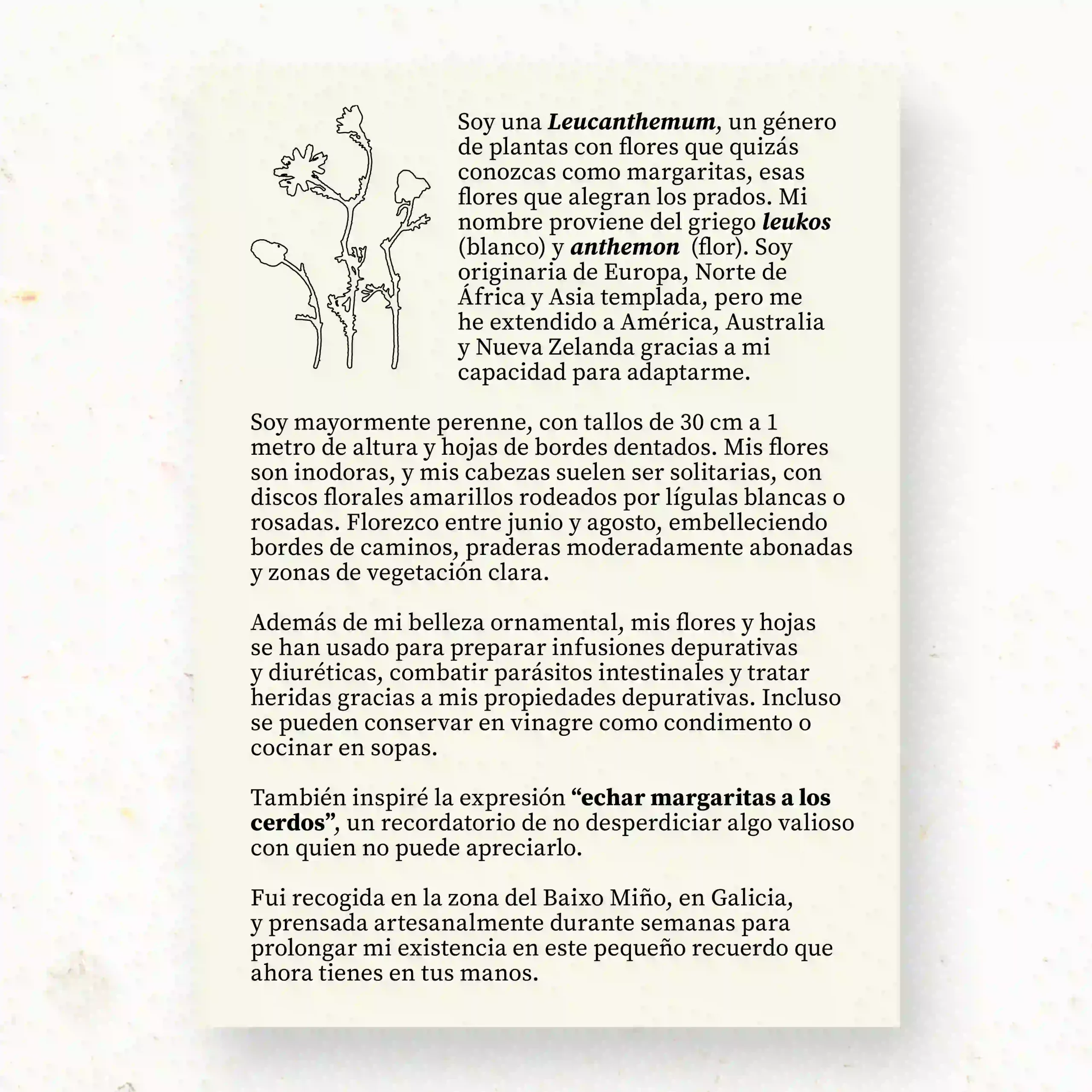 Tarjeta botánica artesanal con flor prensada de margarita silvestre (Matricaria chamomilla, variedad afín de manzanilla). Esta planta, conocida por su sencillez y su delicado aroma, ha sido recolectada de forma consciente y prensada durante varias semanas para conservar sus detalles y su estructura original.