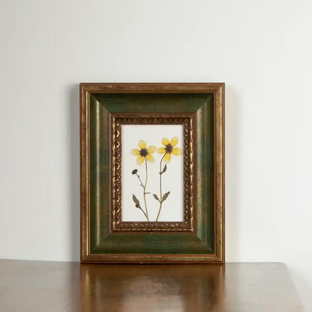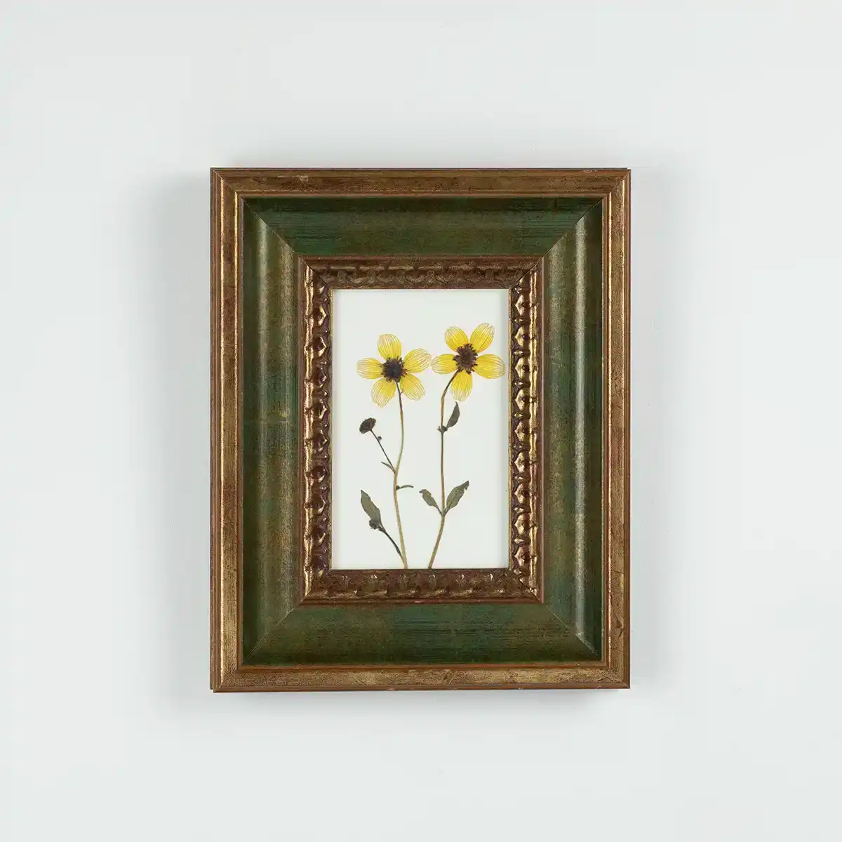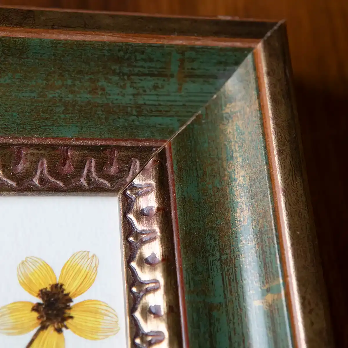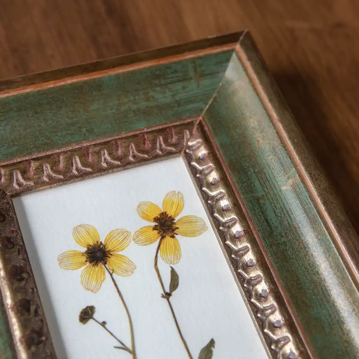 El marco es de madera con moldura profunda y ancha, en tonos verde musgo y dorado envejecido. Su textura estriada —con relieves de inspiración vegetal o barroca— crea un contraste sutil entre lo rústico y lo ornamental. Una combinación que aporta equilibrio entre lo silvestre y lo elaborado.