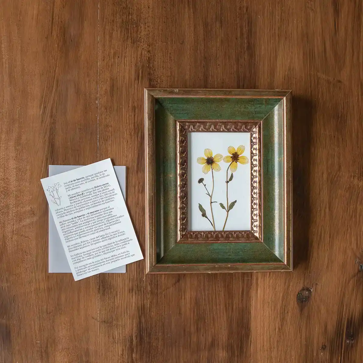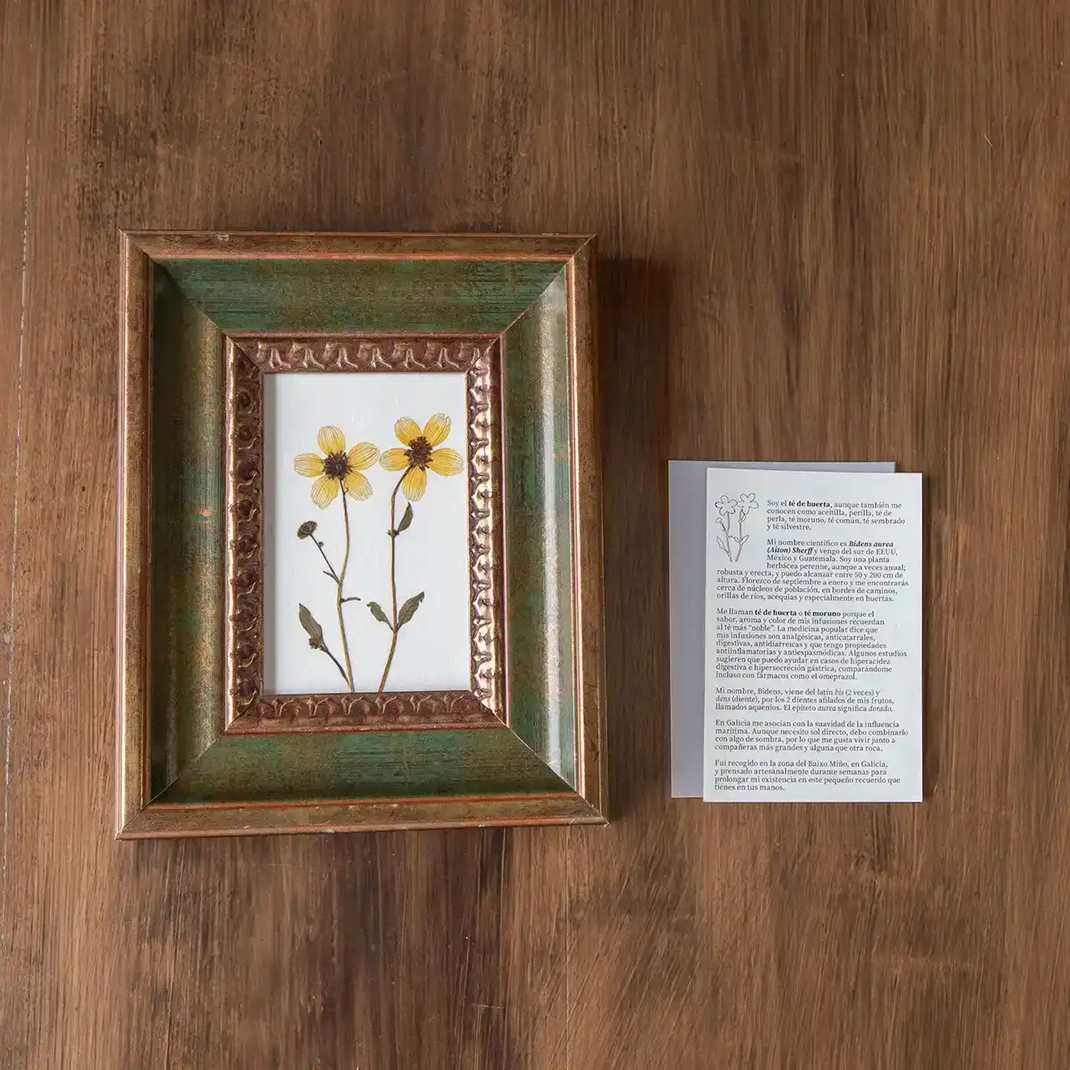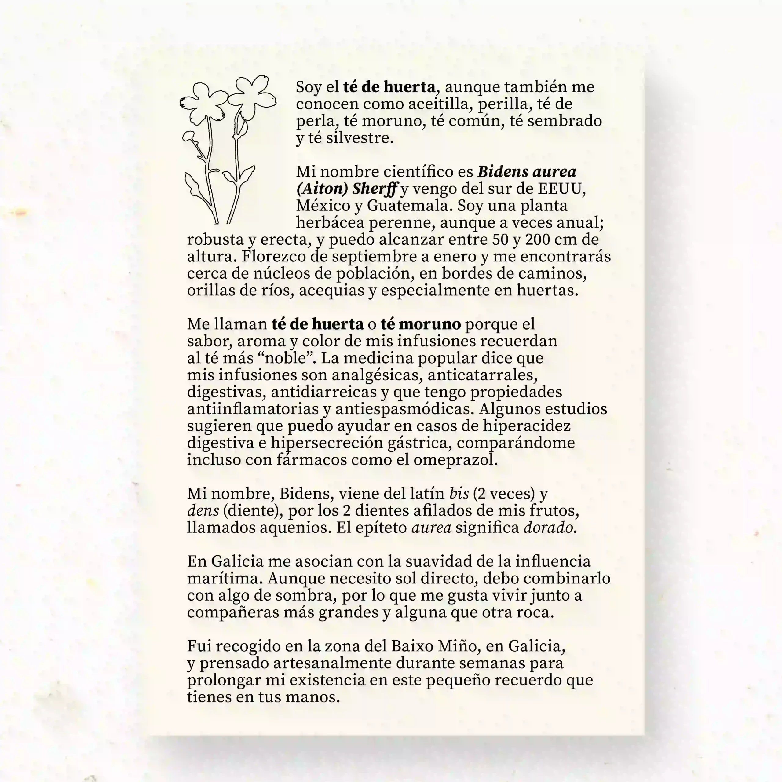 Flores prensadas de «Té de la huerta» (Bidens aurea), una planta silvestre de origen americano que ha echado raíces en caminos, márgenes y huertas de la península. En esta pieza, tres tallos completos se disponen de forma vertical sobre fondo blanco de cartulina de acuarela libre de ácidos, resaltando su estructura ligera y sus tonos cálidos.