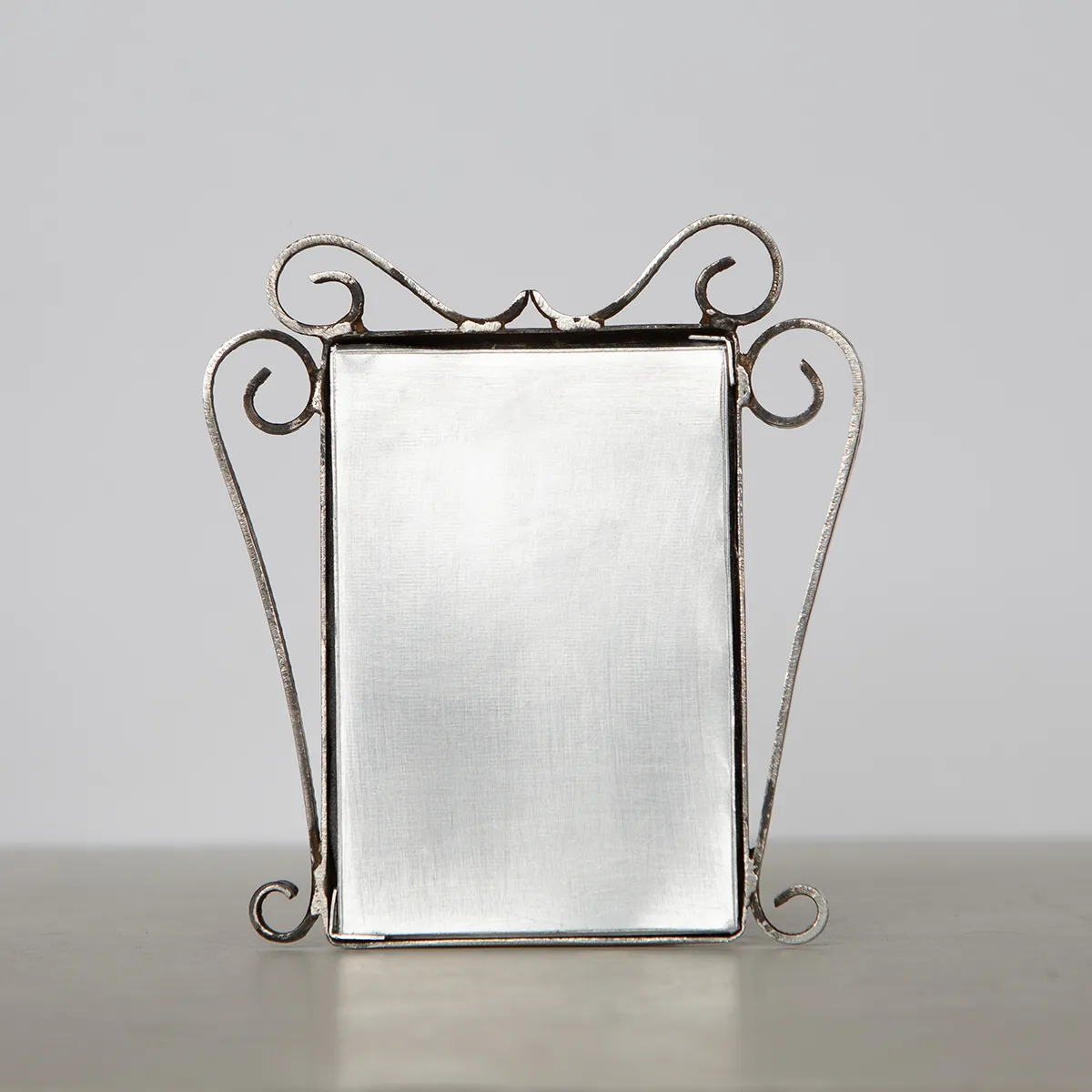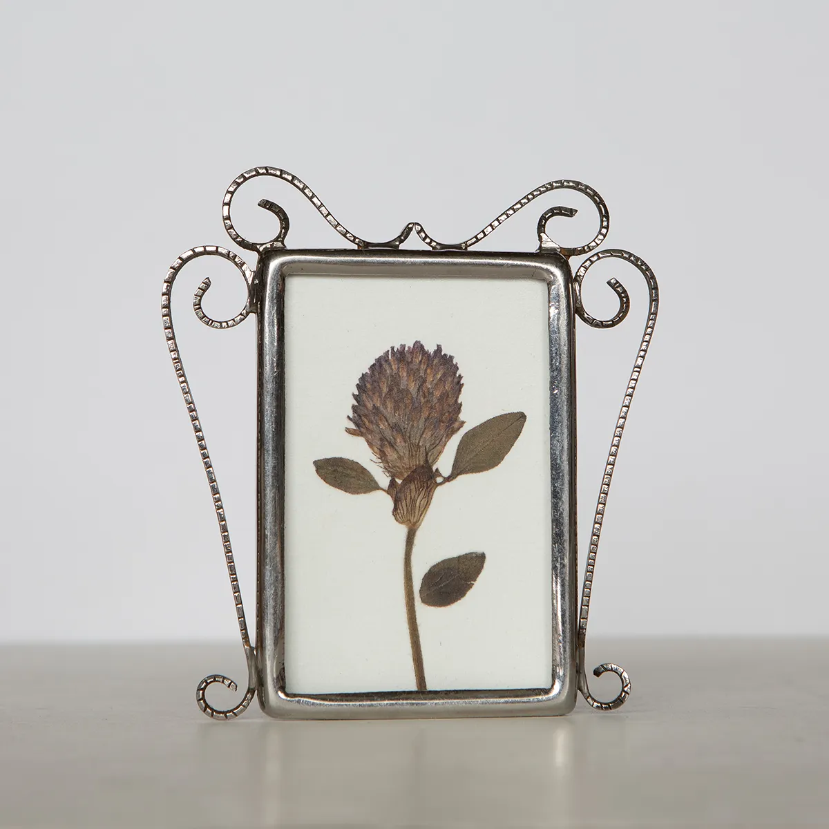 La pieza está montada sobre un marco de acero ornamentado, con diseño de curvas y volutas que recuerda a los marcos antiguos de sobremesa. Su formato vertical y simétrico aporta un aire clásico y sobrio que contrasta con la sencillez silvestre del trébol.